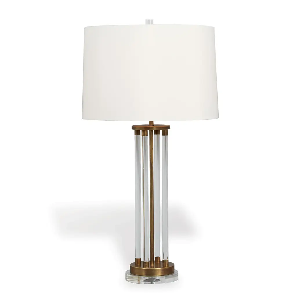 With a nod to art deco, our Moderne Lamp celebrates the round turnings of lucite and rich, aged brass. Size: 36"H x 18"D Shade: 17" x 18" x 12" SH. Round Drum Hardback Shade Materials: lucite, aged brass Uses one 150-watt bulb. Three-way switch Brass hardware. Lucite finial. UL approved. Ships via UPS Free shipping in the U.S.