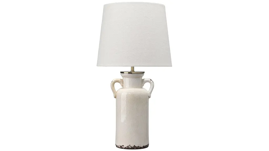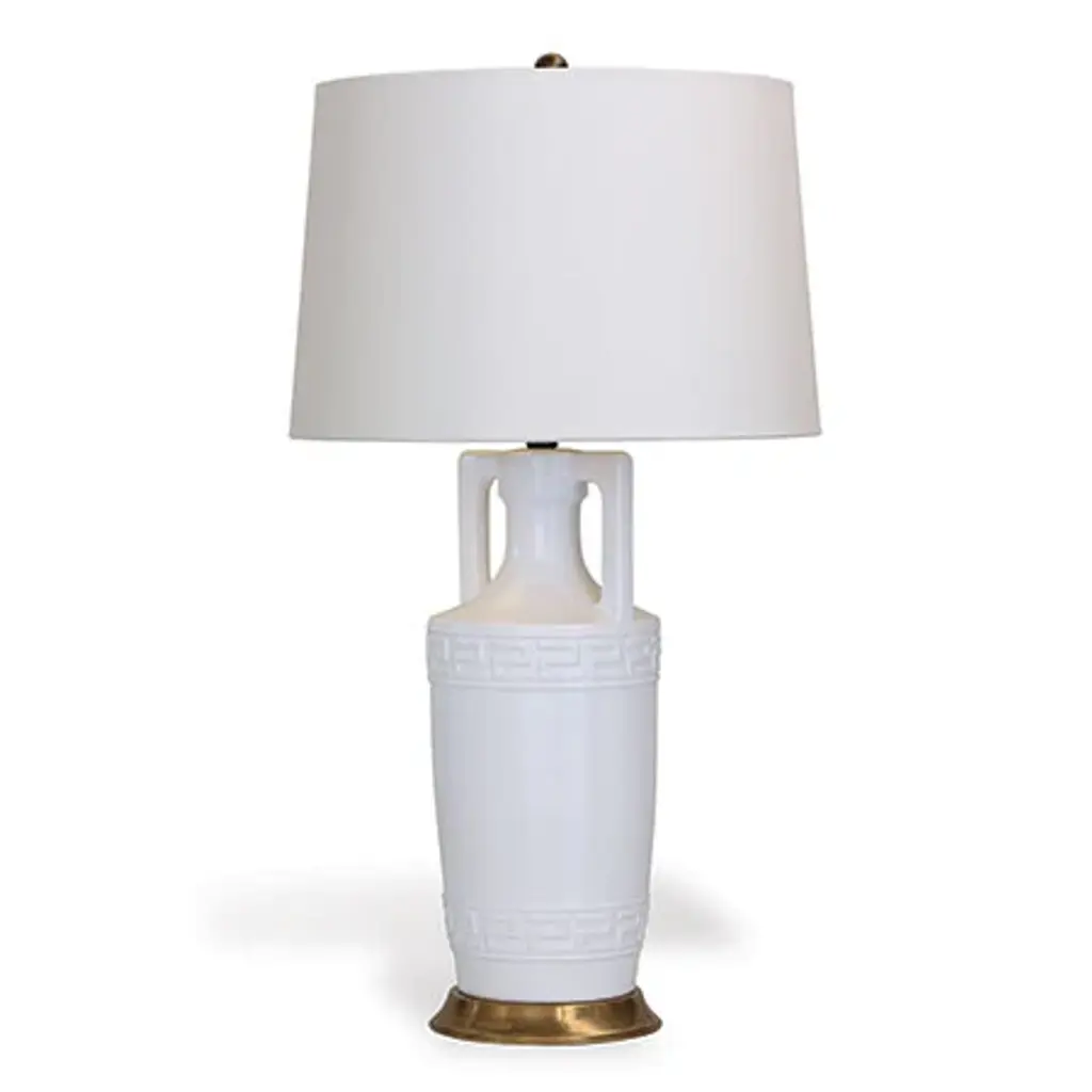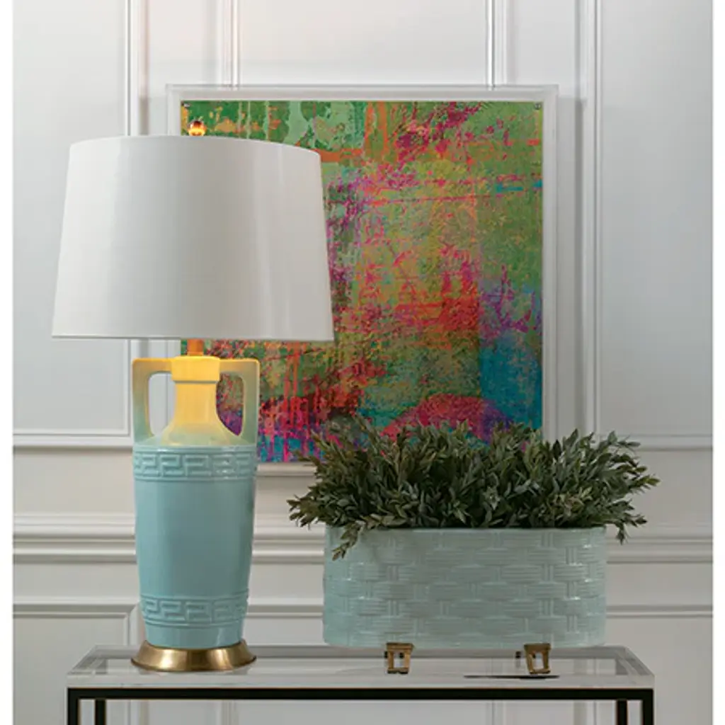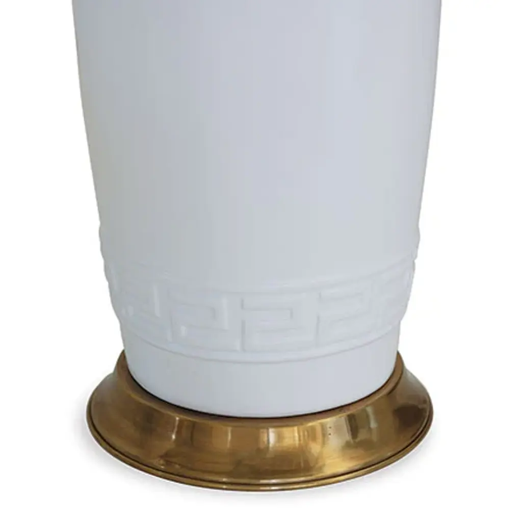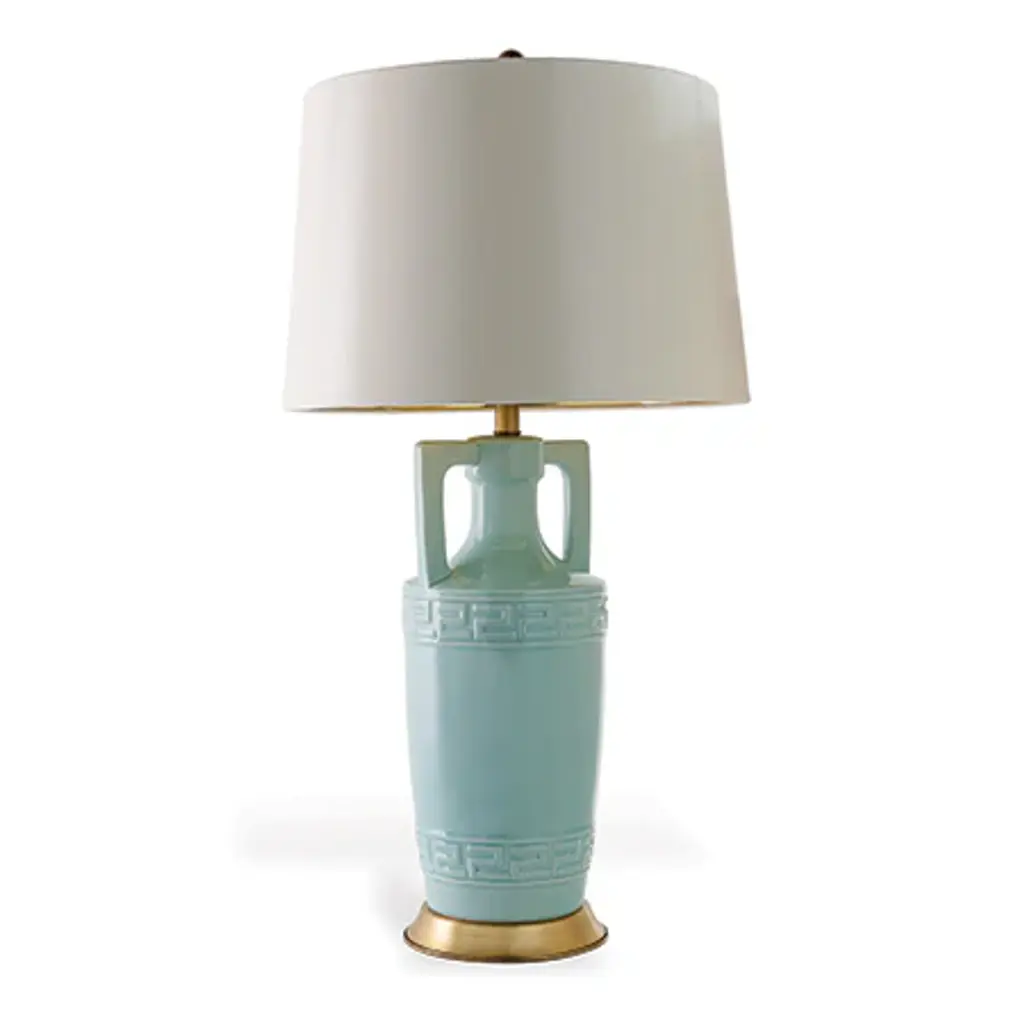 Our Hollywood regency styled lamp features a carved key pattern in the lamp base with a celadon green, blue, or white glazed porcelain body. Accents of a solid brass base and aged brass finished ball finial. Overall Dimensions: 34"H x 18"D 3 way switch. 150 watt max. Shade: 16" x 18" x 12" SH. Hardback drum shade with soft rolled edge trim. Faux lizard skin fabric. Interior of shade is lined in gold foil. Brass spider. Materials: porcelain, brass Ships via FedEx Authorized Port 68 retailer Free shipping in the U.S.