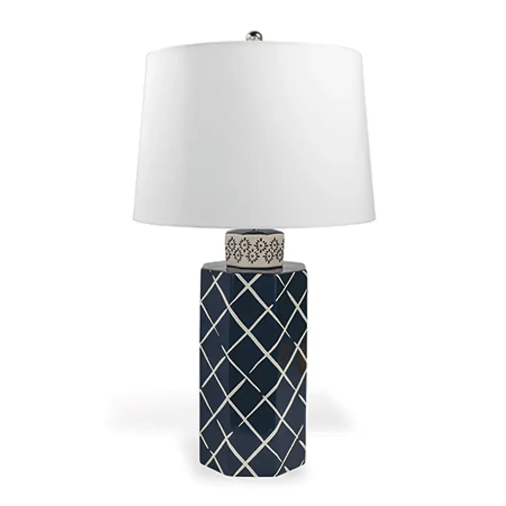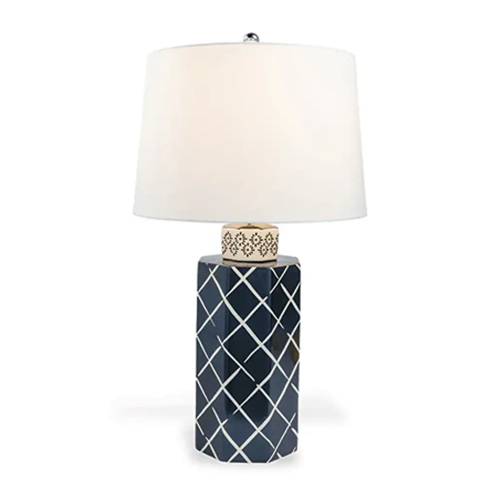 Sconset by Madcap Cottage brings to mind a classic cottage perched high above the shore festooned with climbing roses. The scent of sea breezes perfumes the air and the crash of the waves add a cymbal-like note to the afternoon drama. Modern with the hexagon shape, the geometric pattern has a painterly inspiration in forever fresh blue and white. Overall Dimensions: 28"H x17"D Accented with nickel hardware. Metal ball finial. 3 way switch. 150 watt max bulb. Shade: Hardback shade with soft rolled edge. 15" top x 17" bottom x 11.5"SH. Off white polyester fabric. Nickel spider. Materials: porcelain Free shipping in the U.S.