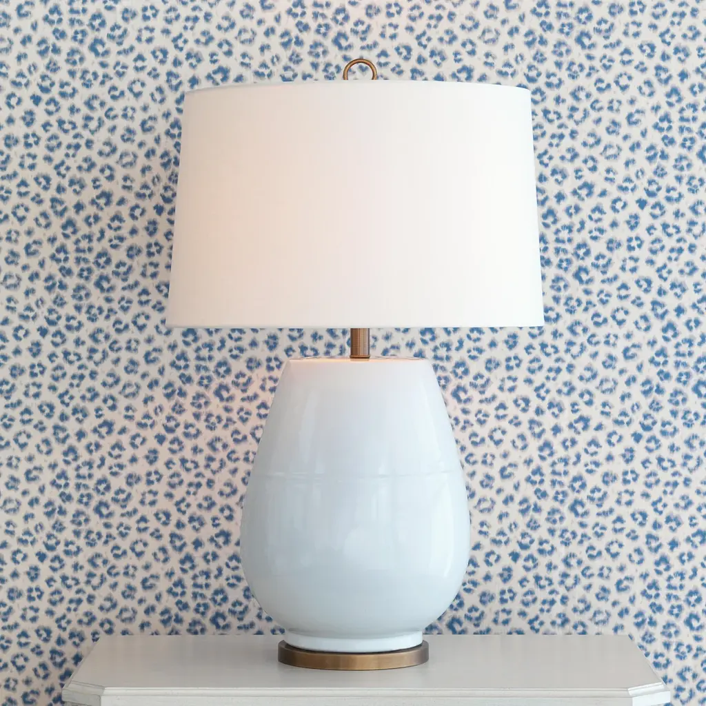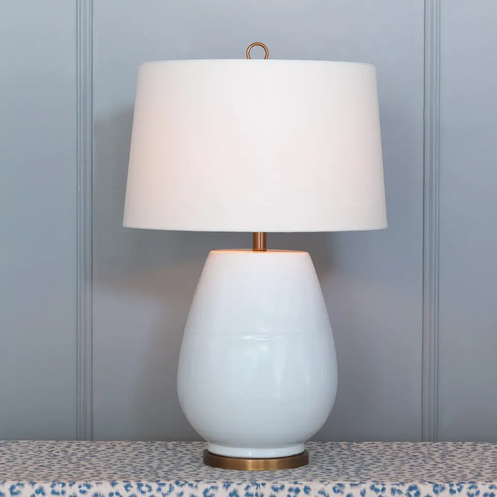 Sonoma features a grand egg shaped porcelain lamp base accented with aged brass finished metal base and hardware. Solid brass ring finial.