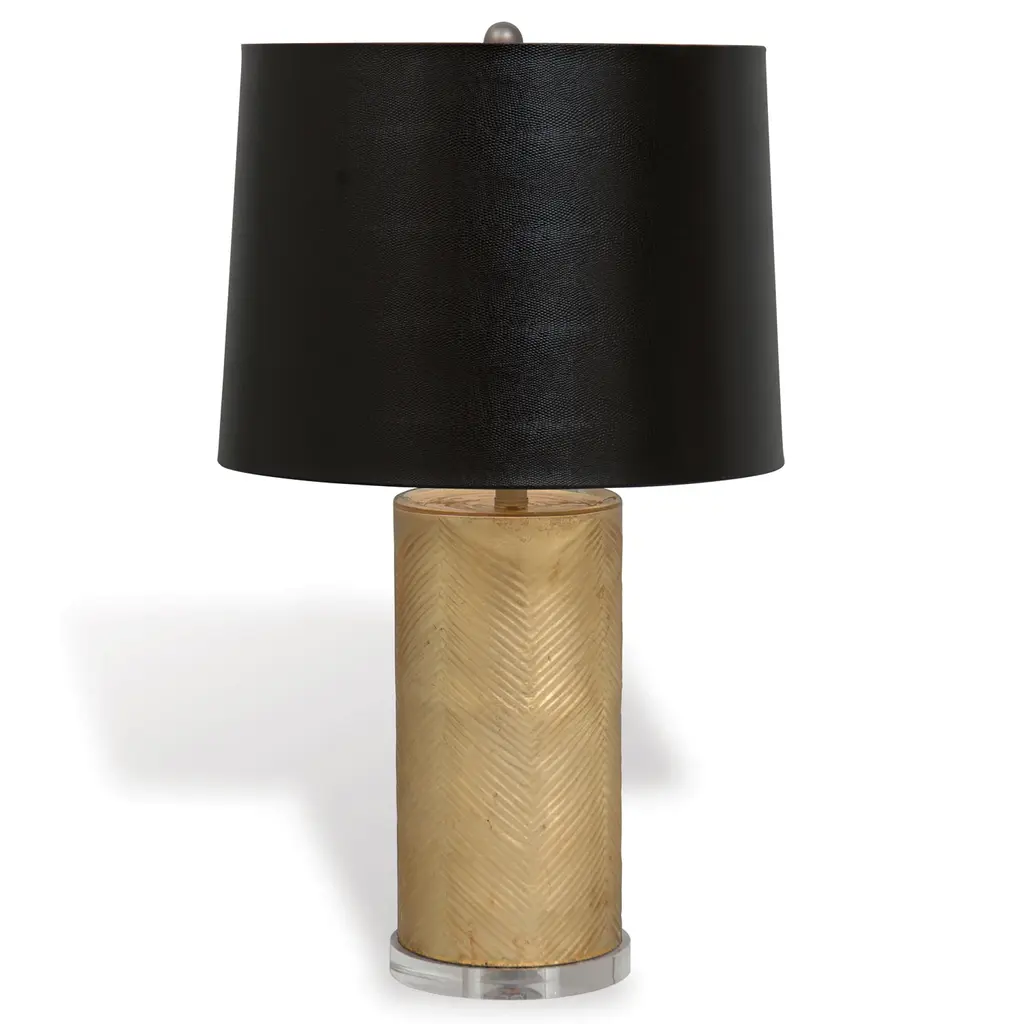 Brighten up any room in your home with this modern cylinder glass table lamp. In a vibrant gold leaf finish that evokes beautiful texture. Atop a round acrylic base and paired with an off-white or black lizard hardback shade. Designed by Port 68. 29" high overall. Shade is 15 1/2" across the top x 17" across the bottom x 12 1/2" on the slant. Uses one maximum 150 watt 3-way bulb (not included). Modern cylinder glass table lamp. Gold leaf finish. Round acrylic base. Off-white polyester or black lizard shade. Ships via UPS Free shipping in the U.S.