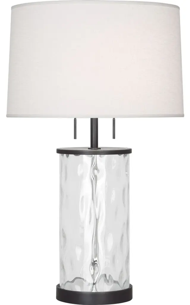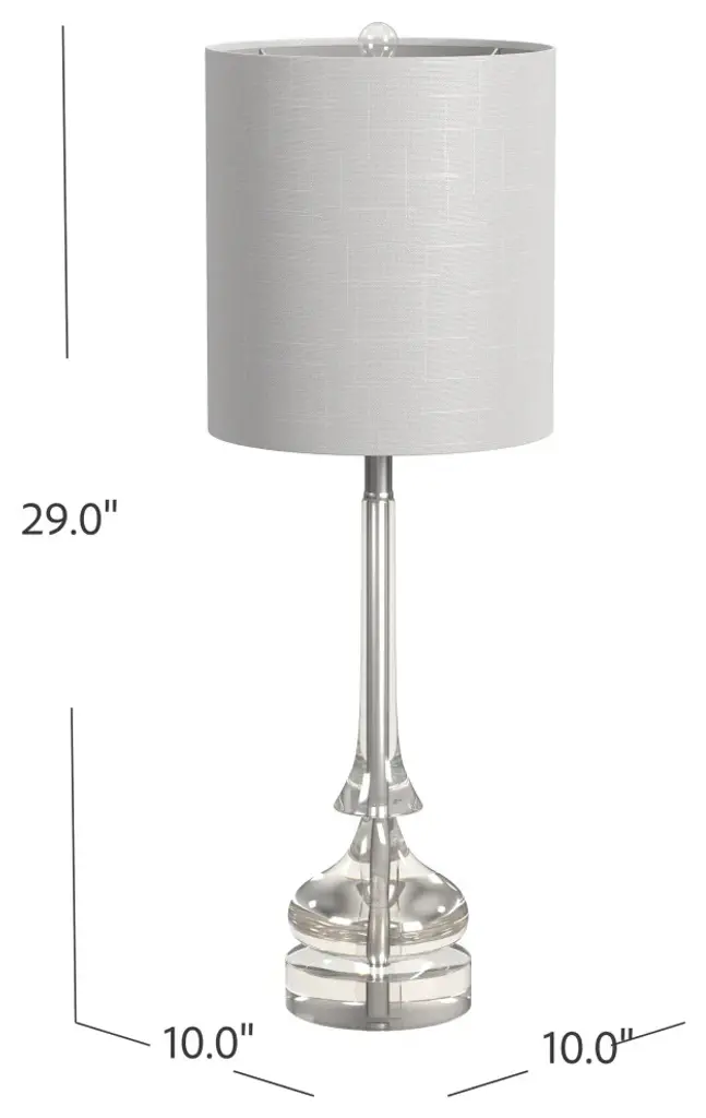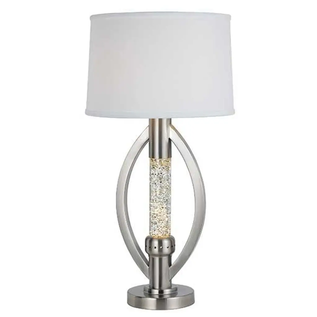 This accent lighting can change the ambiance of any room. Its ultra modern design showcases sparkling decorative mood light, with tiny rippling water-droplets to simulate the soothing dancing water motion. Beautifully crafted stand features high quality satin nickel finish metal and glass, and an elegant circular lamp shade. Great addition piece on your night stand, end table, or sofa table. It offers flexible lighting solution: a table lamp with a main light that is suitable for reading, perfect for a night light, and to create the mood in any room. Made of satin nickel finish metal, glass tube and fabric shade 4-ways socket switch Included three (3) 25-watt E17 bulbs; UL listed Requires one (1) 100-watt E26 or E27 bulb (not included) Clean with a soft, dry cloth Assembly required Additional dimensionShade size: 14"x 15" x 10"H