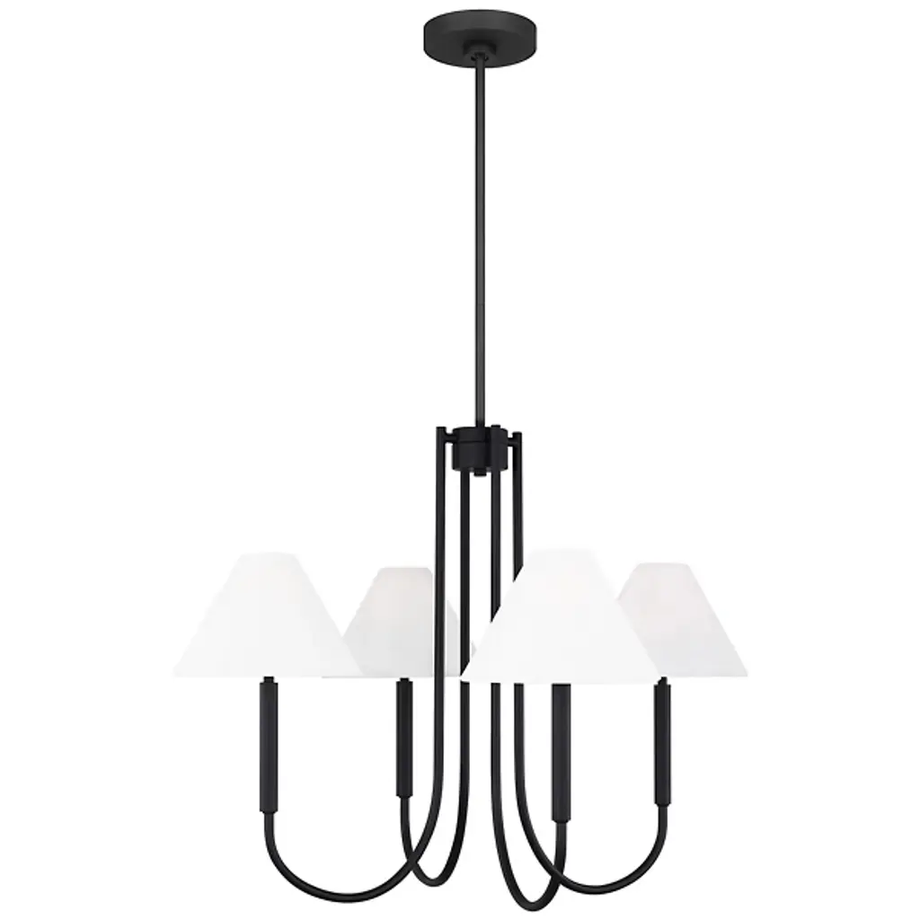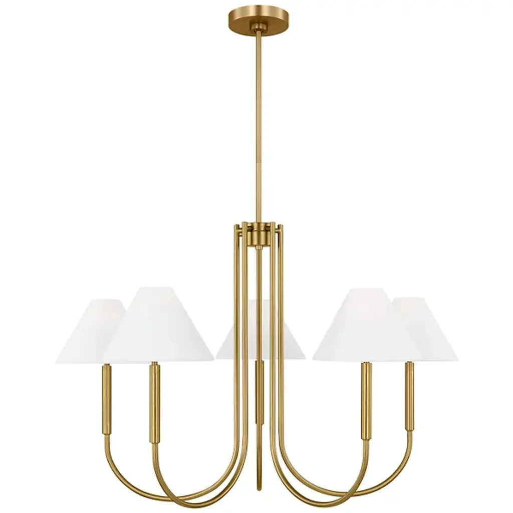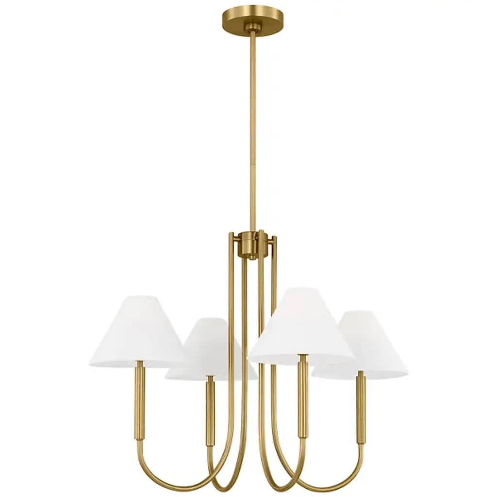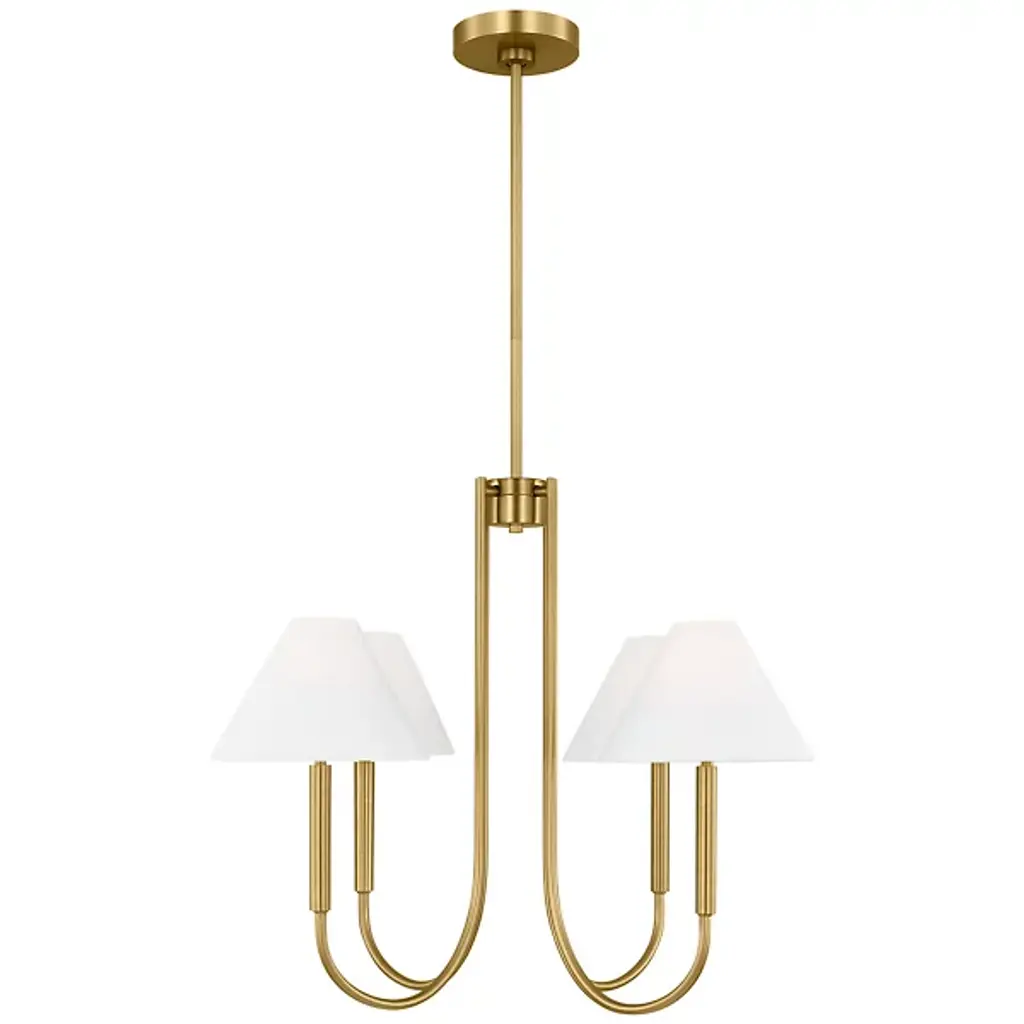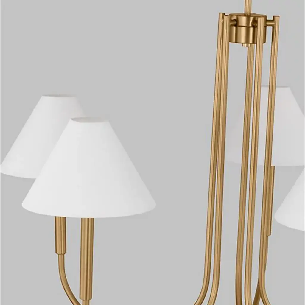The Porteau Chandelier from Visual Comfort Studio lends an intricate, vintage-style presence to interiors. Open and elegant, it extends downward from a circular canopy along a slim stem, terminating in a small round hub that sends outward-curving arms to the fixture’s lamping. Each lamp is moderated by a flared conical shade of pale linen that obscures direct light to the sides, glowing from within as they dispense a broad wash of light evenly around the fixture, glittering off the clean-surfaced metal.