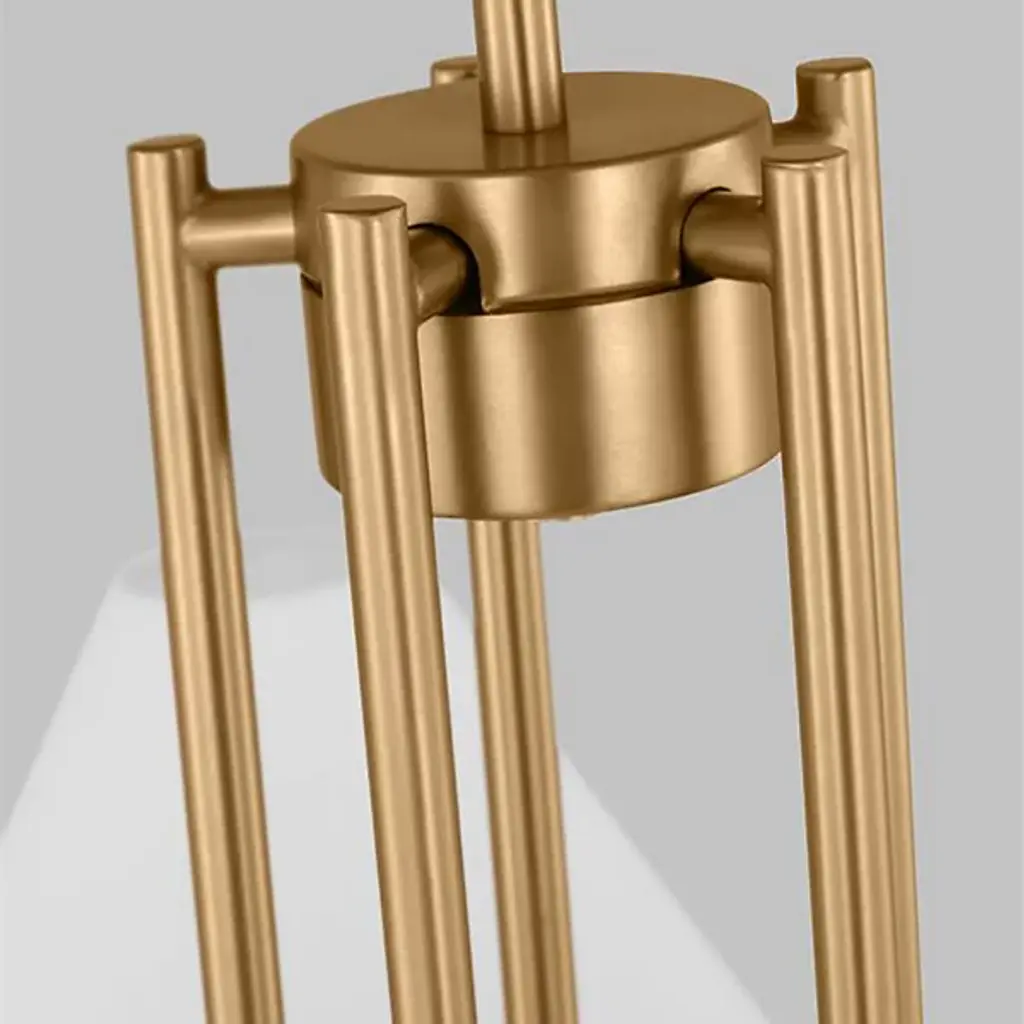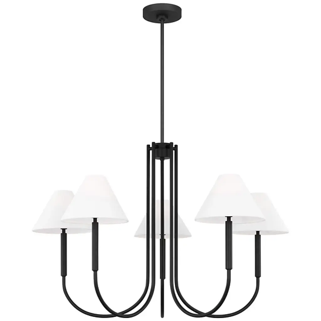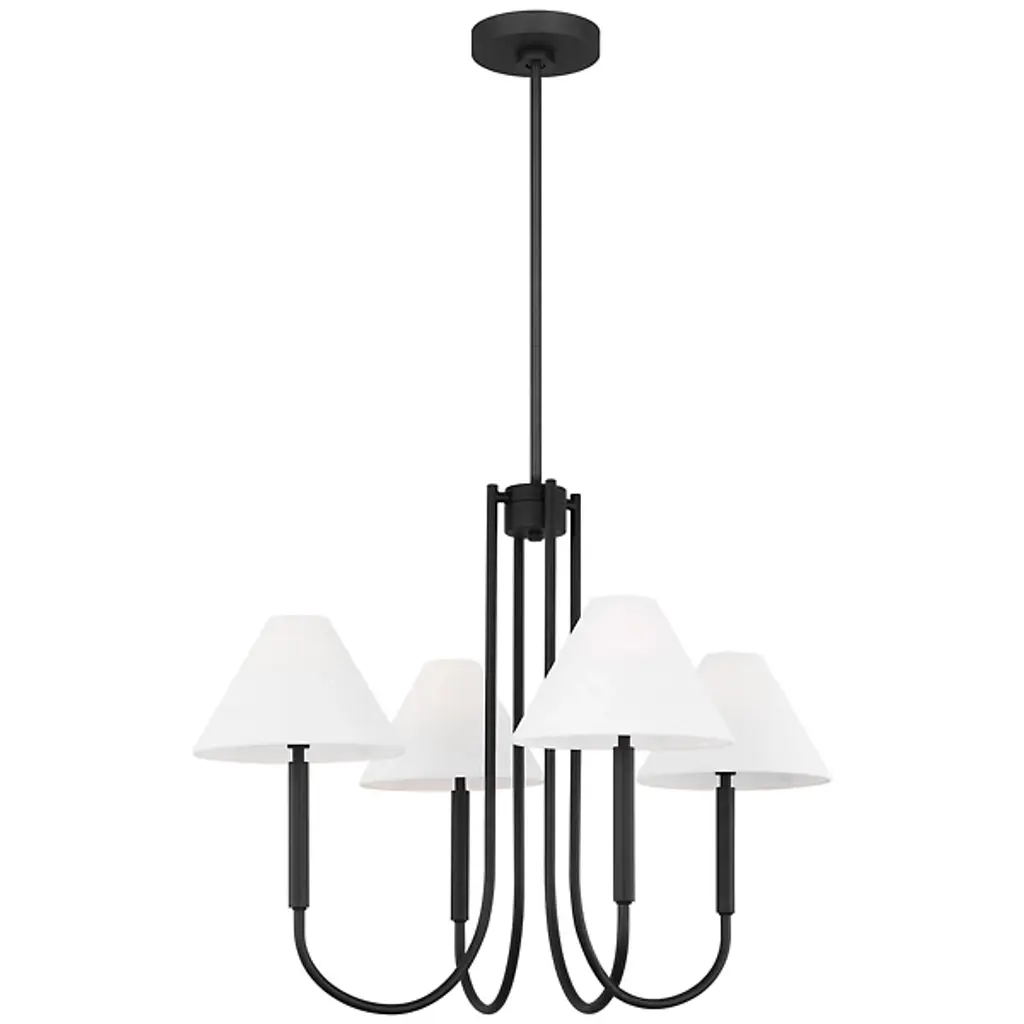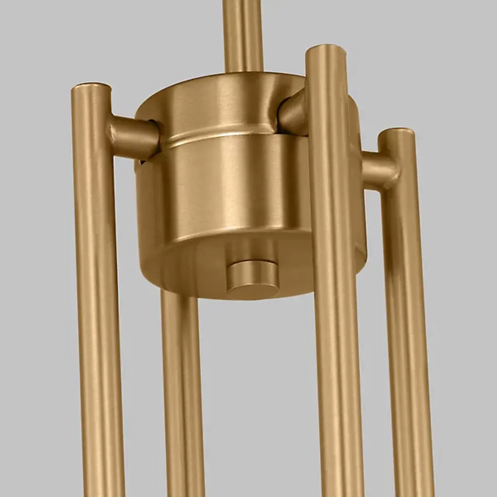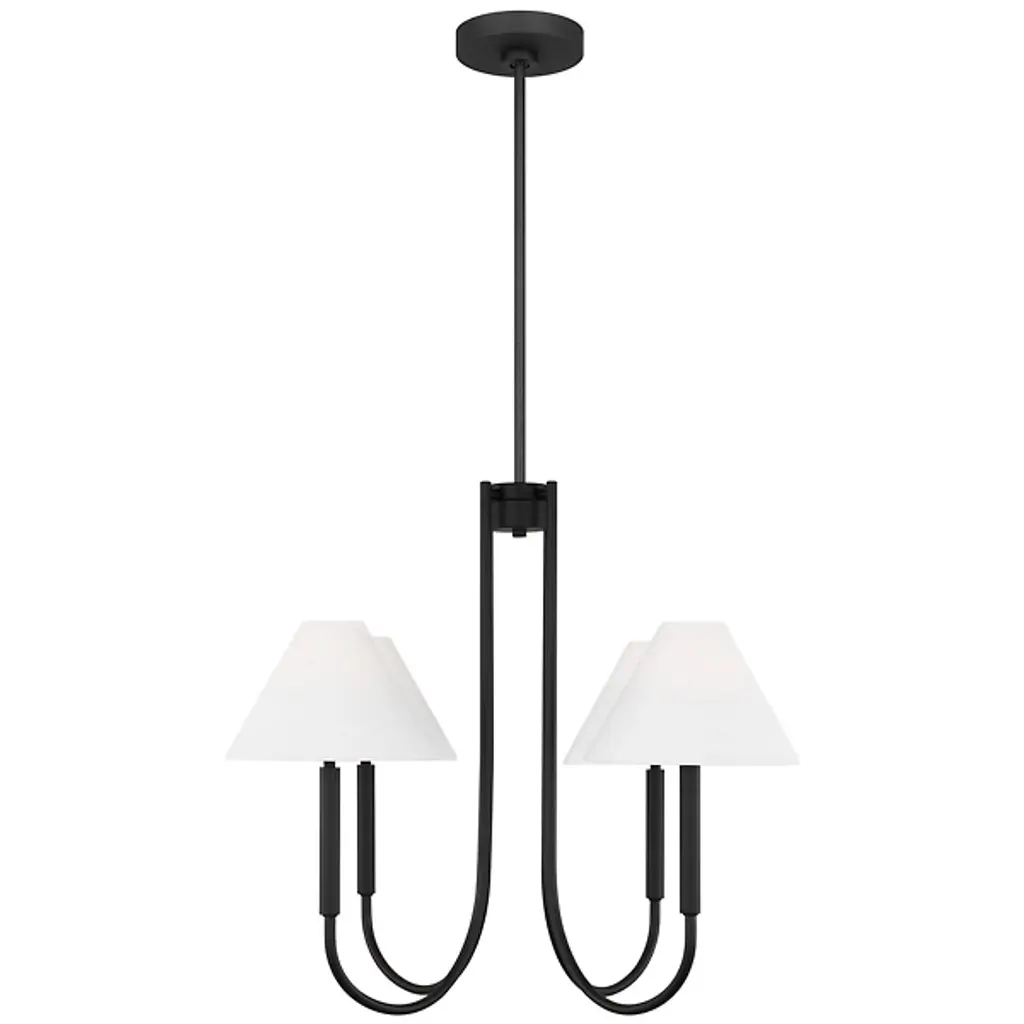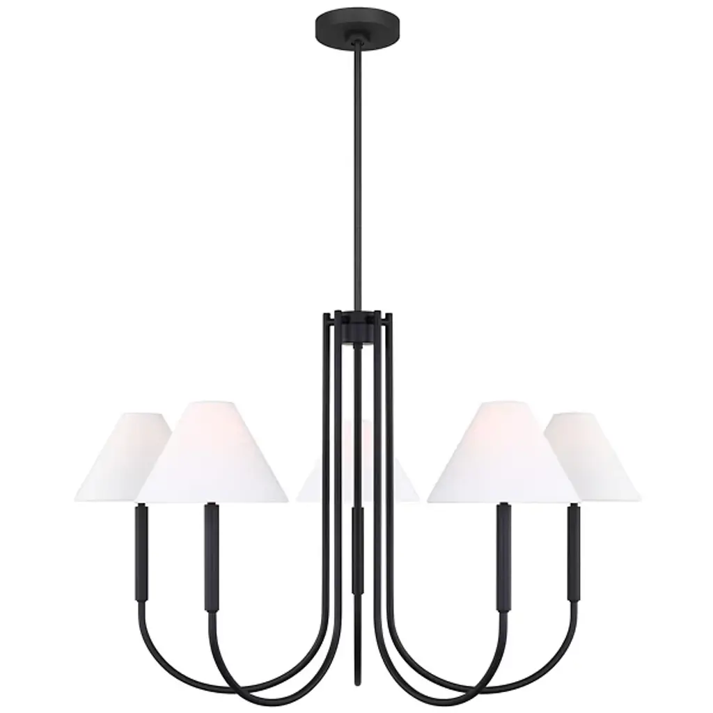 The Porteau Chandelier from Visual Comfort Studio lends an intricate, vintage-style presence to interiors. Open and elegant, it extends downward from a circular canopy along a slim stem, terminating in a small round hub that sends outward-curving arms to the fixture’s lamping. Each lamp is moderated by a flared conical shade of pale linen that obscures direct light to the sides, glowing from within as they dispense a broad wash of light evenly around the fixture, glittering off the clean-surfaced metal.