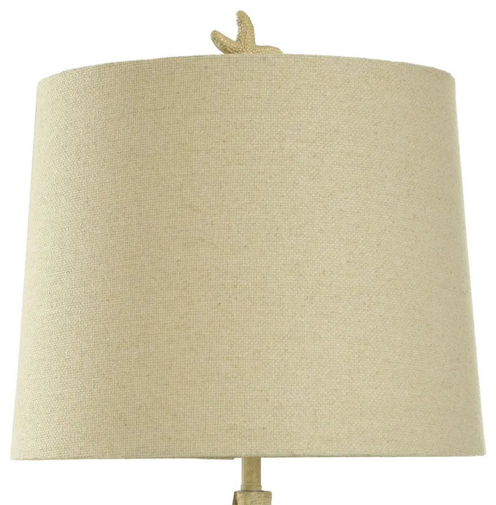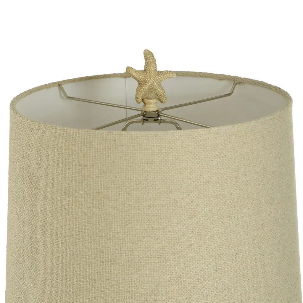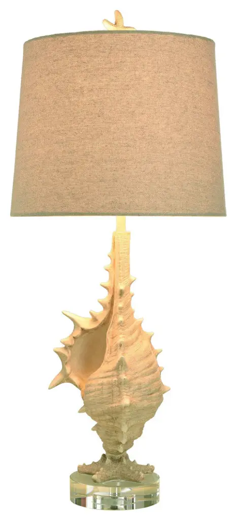 The Porthaven Tan Table Lamp by StyleCraft exudes a coastal aesthetic with its open conch shape on top of the acrylic base. It''s finished in a sand yellow and accompanied by a light beige shade, evoking the beach and ocean. Set this table lamp on a side table or console table in the living room for an oceanic quality.Features -Bring a little edge to your coastal design with this spikey murex conch like seashell lamp with a detailed dark cream finish on top of an acrylic base.Textured Light Beige Round Hardback Empire Shade With A Starfish Finial150W 3-way bulb is required but not provided for its 3-way switch.Specifications -Location Rating: IndoorDue to lighting and monitor differences, actual colors and finishes may vary slightly from what appears online.
