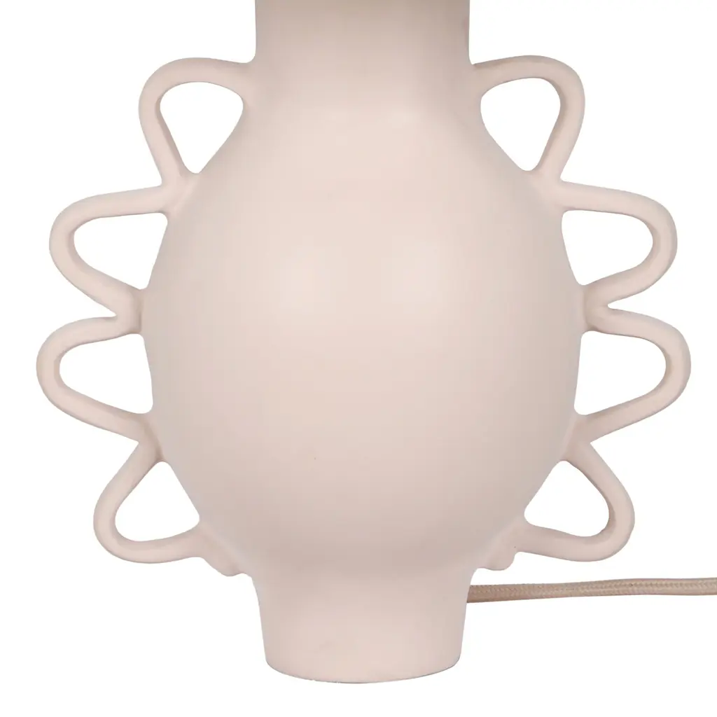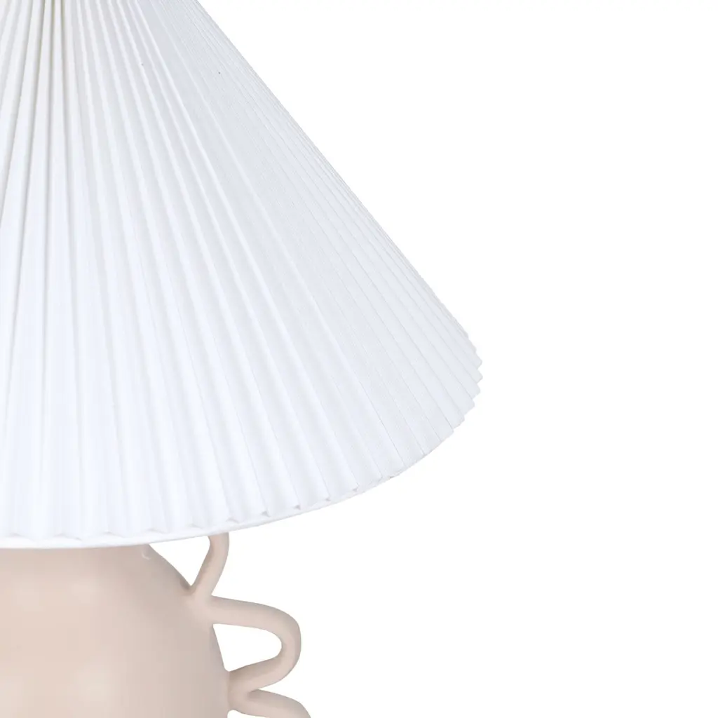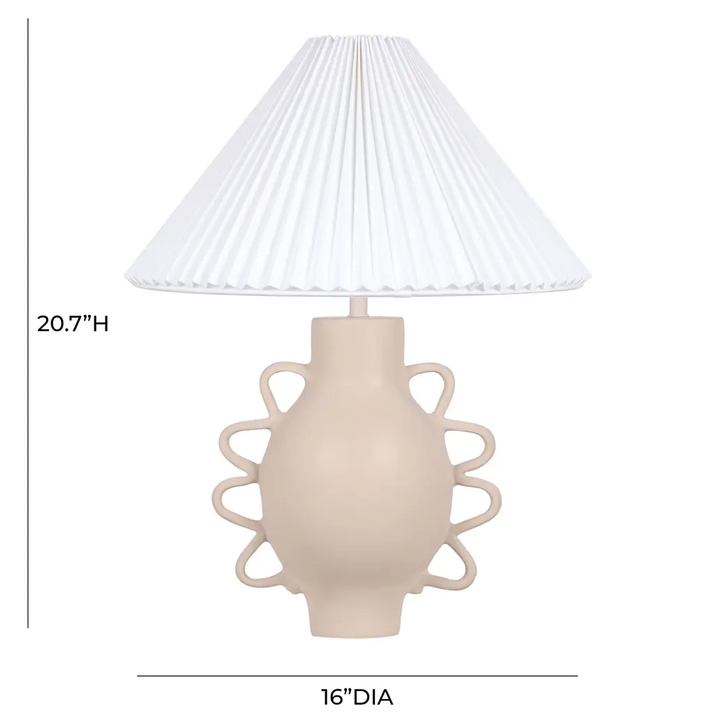 Featuring a faux-stone base adorned with ornamental loops, the Portia table lamp is a whimsical wabi-sabi statement piece topped with a white pleated empire shade. Handcrafted in India, the artisan base is detailed with an organically textured finish in a choice of neutral colors. An ambient lighting solution with a handmade beauty, this eclectic base and shade set adds instant personality to any desk, tabletop or nightstand.