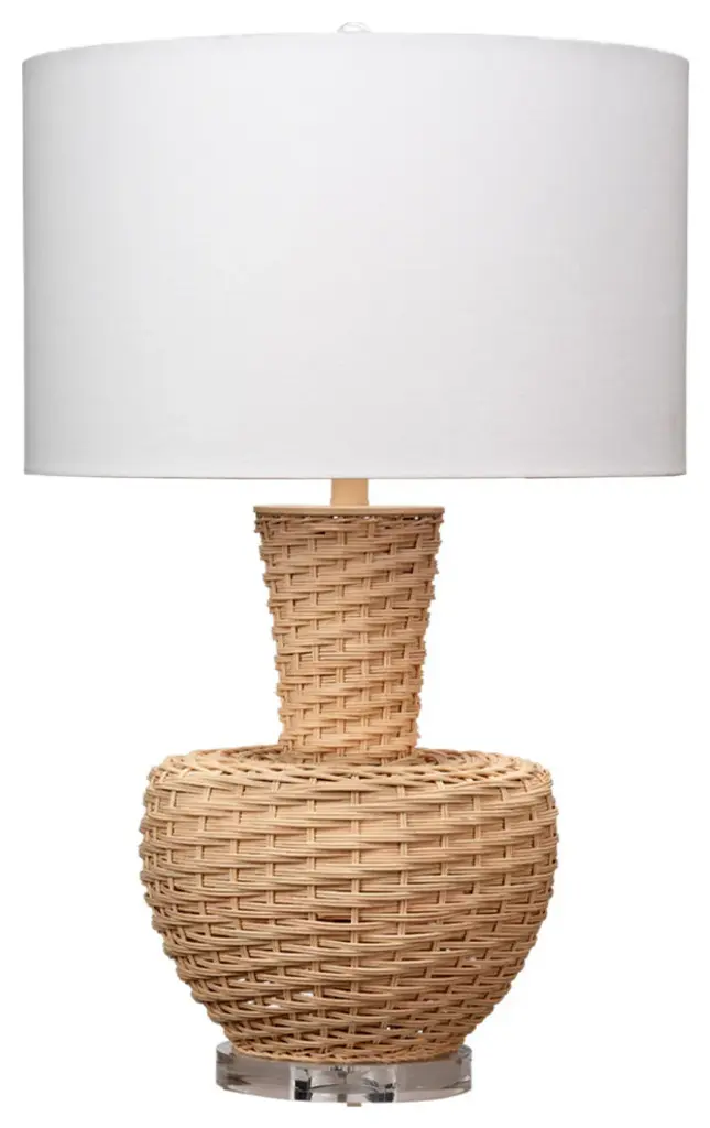 A crystal-clear acrylic base and a creamy linen drum shade expertly elevate an otherwise casual coastal lamp. The curvy mushroom inspired body adds a touch of whimsy and grounds the design. If you''re looking to create a light, bright, polished, and welcoming space for friends and family, this is the choice for you.Metal Base with Handwoven Rattan100% White Linen Drum shade, Rolled Edge Acrylic Clear Base: 1"H x 7"Dia.Acrylic Clear Ball Finial9.5"H Nickel Harp, Silver SpiderThe inherent variations in tone and texture of natural rattan are preserved, to create pieces rich in detail and natural beauty. These unique imperfections give our products character and individuality, with each piece having its own personality. We''ve done our best to represent product as closely as possible; however, different lighting and settings in photography, phone or computer settings may slightly affect color and appearance. Lamp Dimensions: 16"H x 11.5"W x 11.5"DShade Dimensions: 11"H x 18"W x 18"D1 bulb required; Bulb Not Included150 Max Wattage, Volts 110E26 Bulb Base Type 8ft Clear Cord3-way SwitchCare Instructions: We do not recommend using harsh or abrasive cleaners at any time as they can damage product. Wipe surfaces gently with soft, dry cloth. If needed, you may use a lightly damp cloth with water only on base.