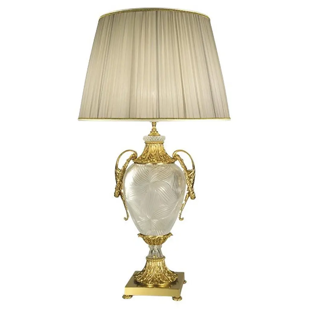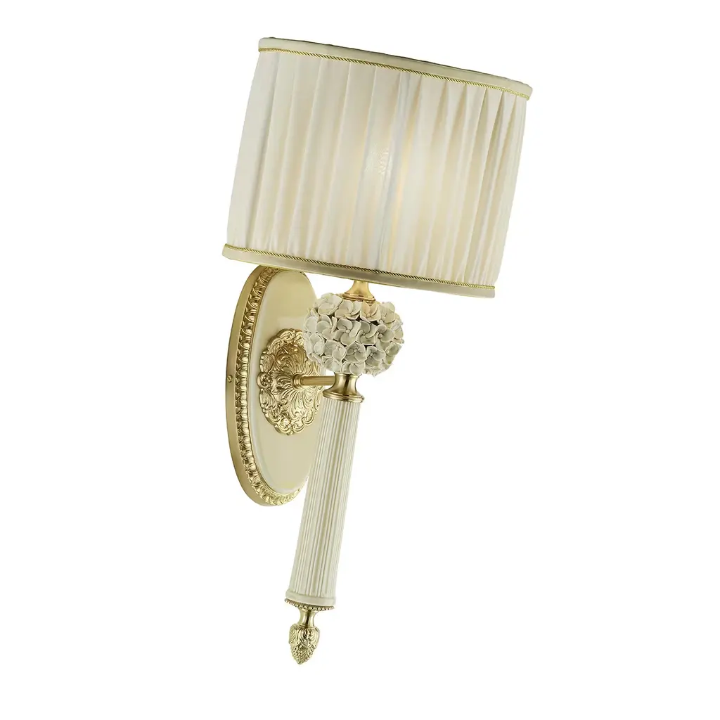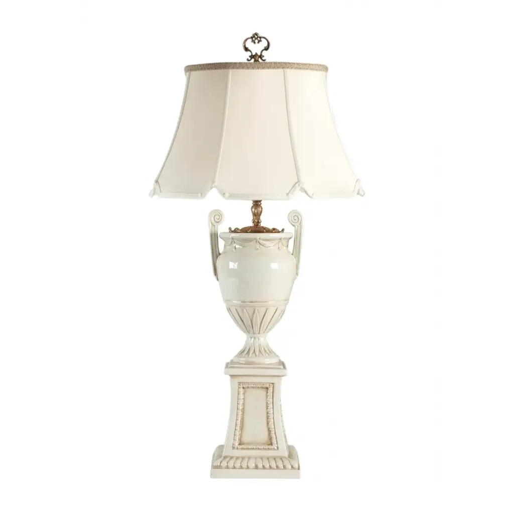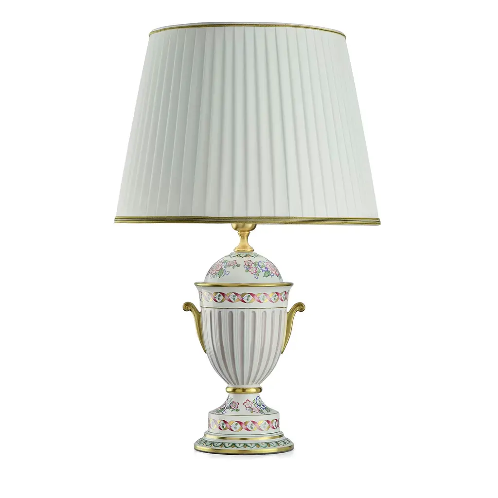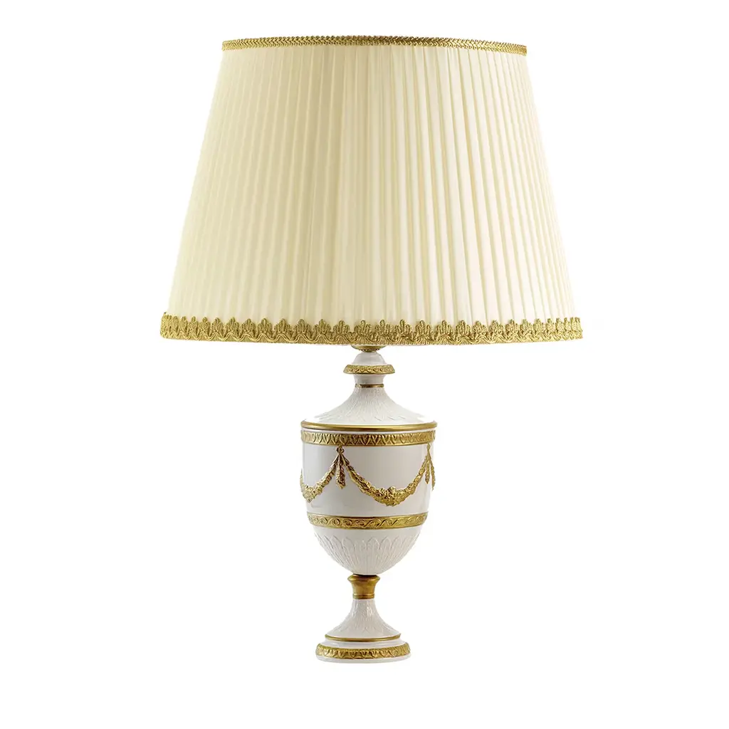 A showcase of unmatched artistry and opulence inspired by the glamorous atmospheres in Portofino, this table lamp is sure to uplift the charm of any classic interior. A pleated, beige-hued fabric lampshade finished with flowery hems provides suffused light, creating a splendid gleam when hitting the golden decorative elements on the trophy-shaped porcelain body.