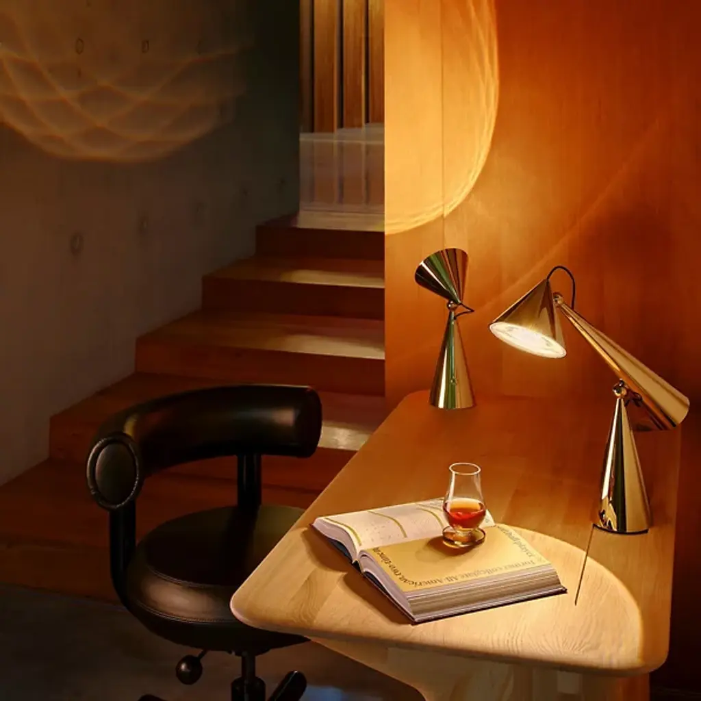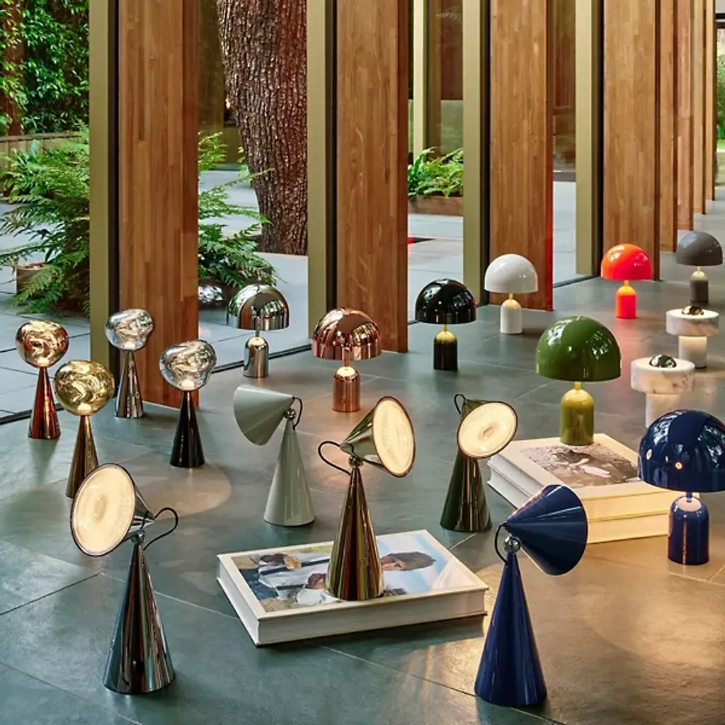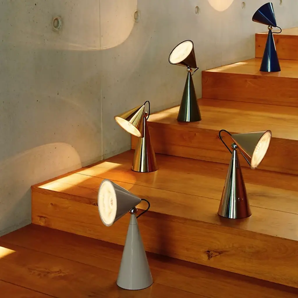 The Pose LED Rechargeable Table Lamp from Tom Dixon features a bold, playful design that balances minimalism with individuality. It features a conical body and head with a flat lens on its face inspired by what you'd see on lighthouses, traffic lights, and scientific instruments. While this bold silhouette is its defining characteristic, its high output light and adjustability also give it adaptability and functionality. This comes in the form of its rechargeable battery and a head that rotates and angles up and down, sending its focused, magnified beam where you need it most.