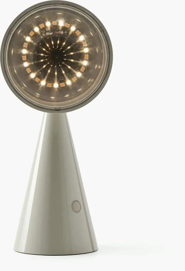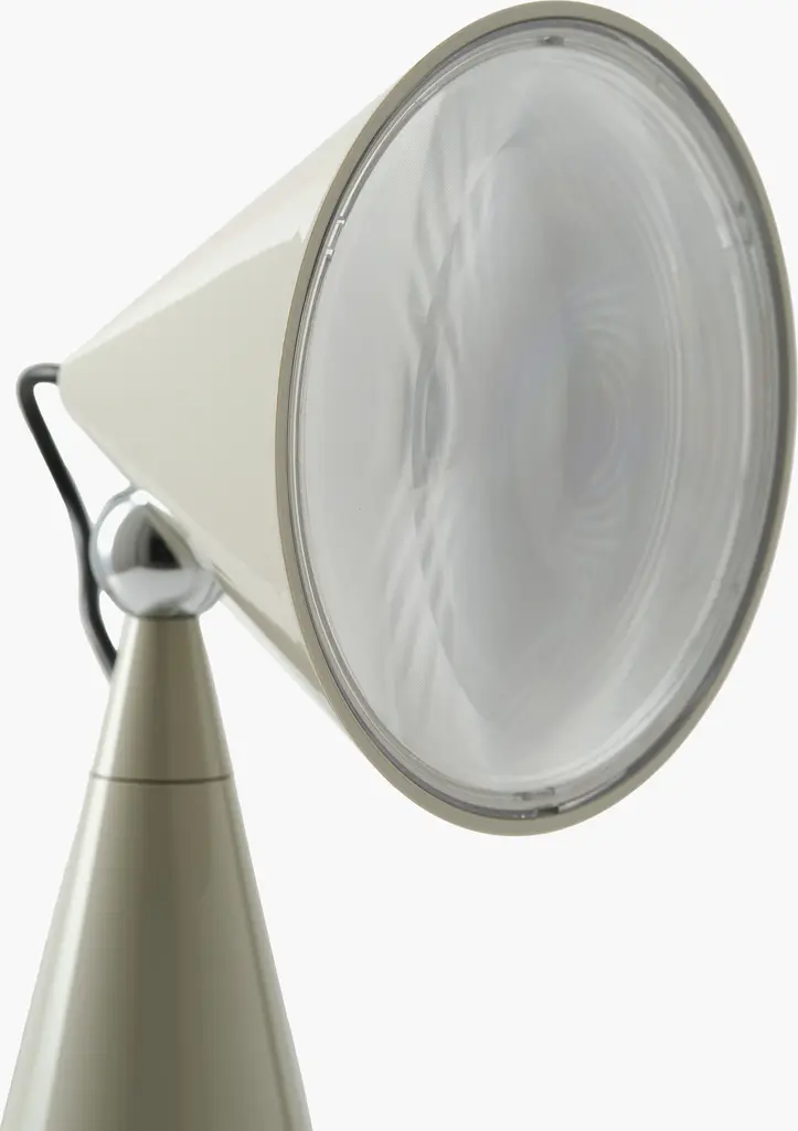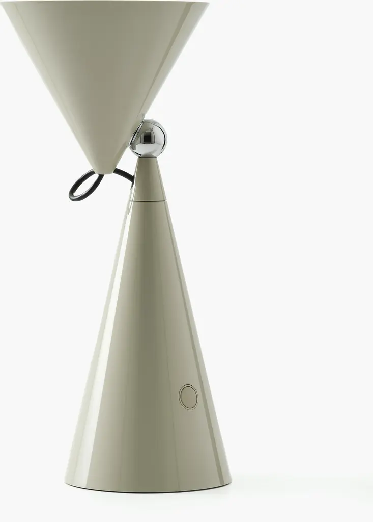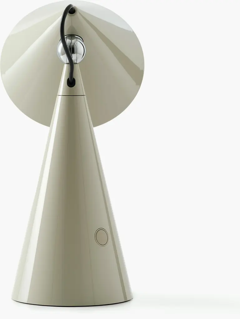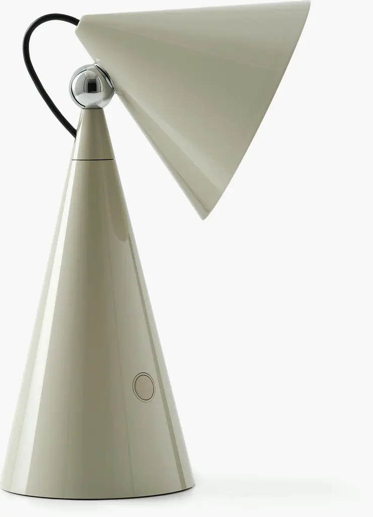 Tom Dixon's Pose Portable (2024) creates focused, directional lighting that brings new dimension to any room. A high-output lamp, it features flat lenses inspired by lighthouses and scientific instruments. Its conical form casts striking, magnified beams that add drama and depth to interiors. This rechargeable lamp offers a 3-step touch-dimmable LED ring, shifting between warm 2700K and 3000K light, with 6 to 9 hours of runtime. Dixon, a pioneer of British design, brings his signature high-gloss aesthetic to this atmospheric piece. Made in China.