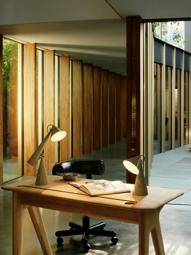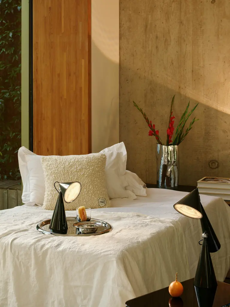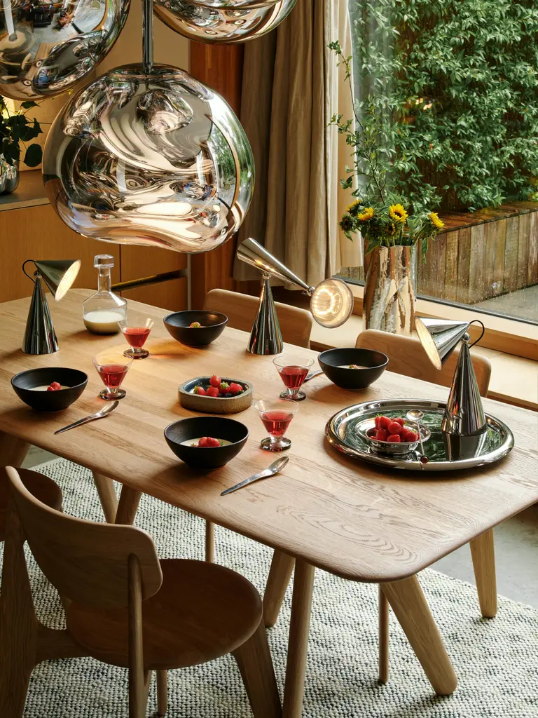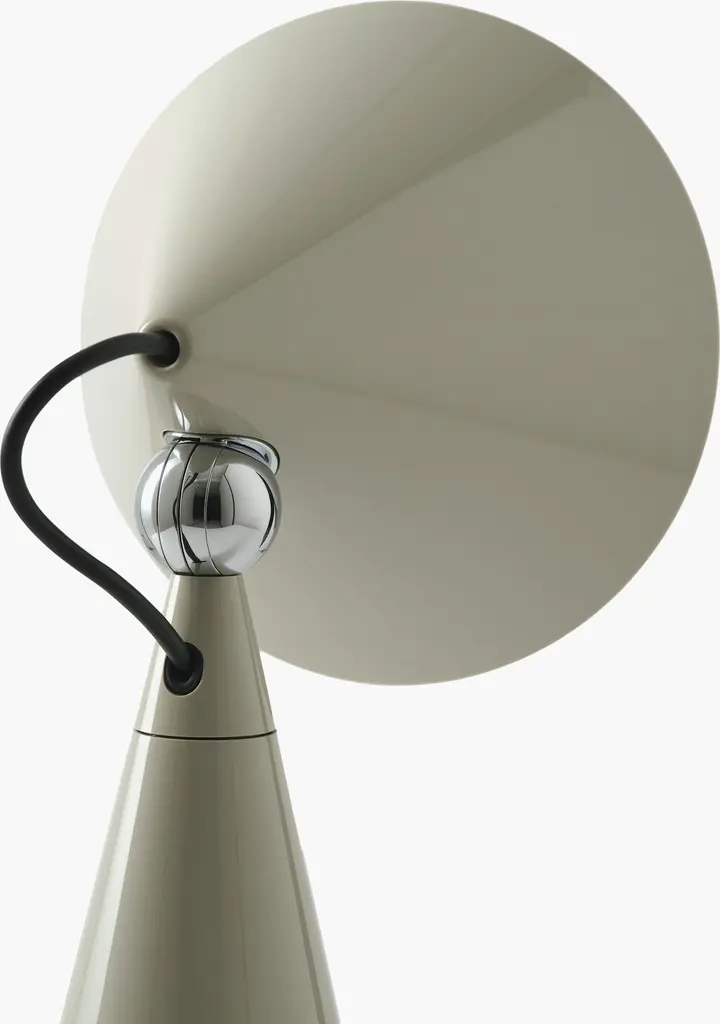 Tom Dixon's Pose Portable (2024) creates focused, directional lighting that brings new dimension to any room. A high-output lamp, it features flat lenses inspired by lighthouses and scientific instruments. Its conical form casts striking, magnified beams that add drama and depth to interiors. This rechargeable lamp offers a 3-step touch-dimmable LED ring, shifting between warm 2700K and 3000K light, with 6 to 9 hours of runtime. Dixon, a pioneer of British design, brings his signature high-gloss aesthetic to this atmospheric piece. Made in China.