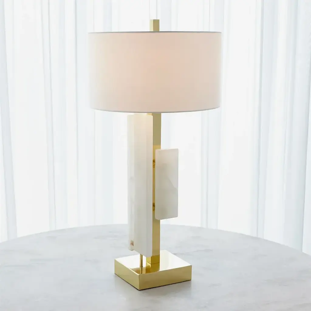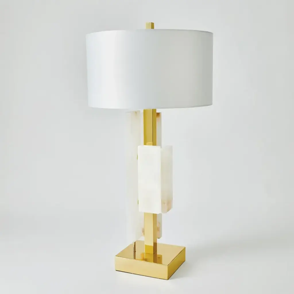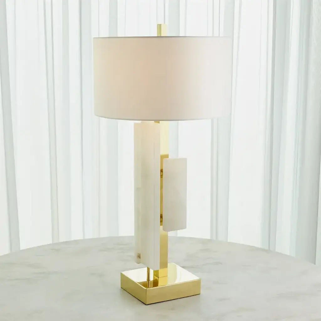The Posh Block Table Lamp features a brass base and four sheets of alabaster with a hardback fabric shade. As alabaster is a natural product, please be aware that there will always be variations in veining and color. This is to be expected and makes every alabaster product uniquely your own. From a fashion forward perspective, Global Views offers accessories, furniture, statement lighting, and an assortment of rugs and mirrors to add beauty and joy to your home.