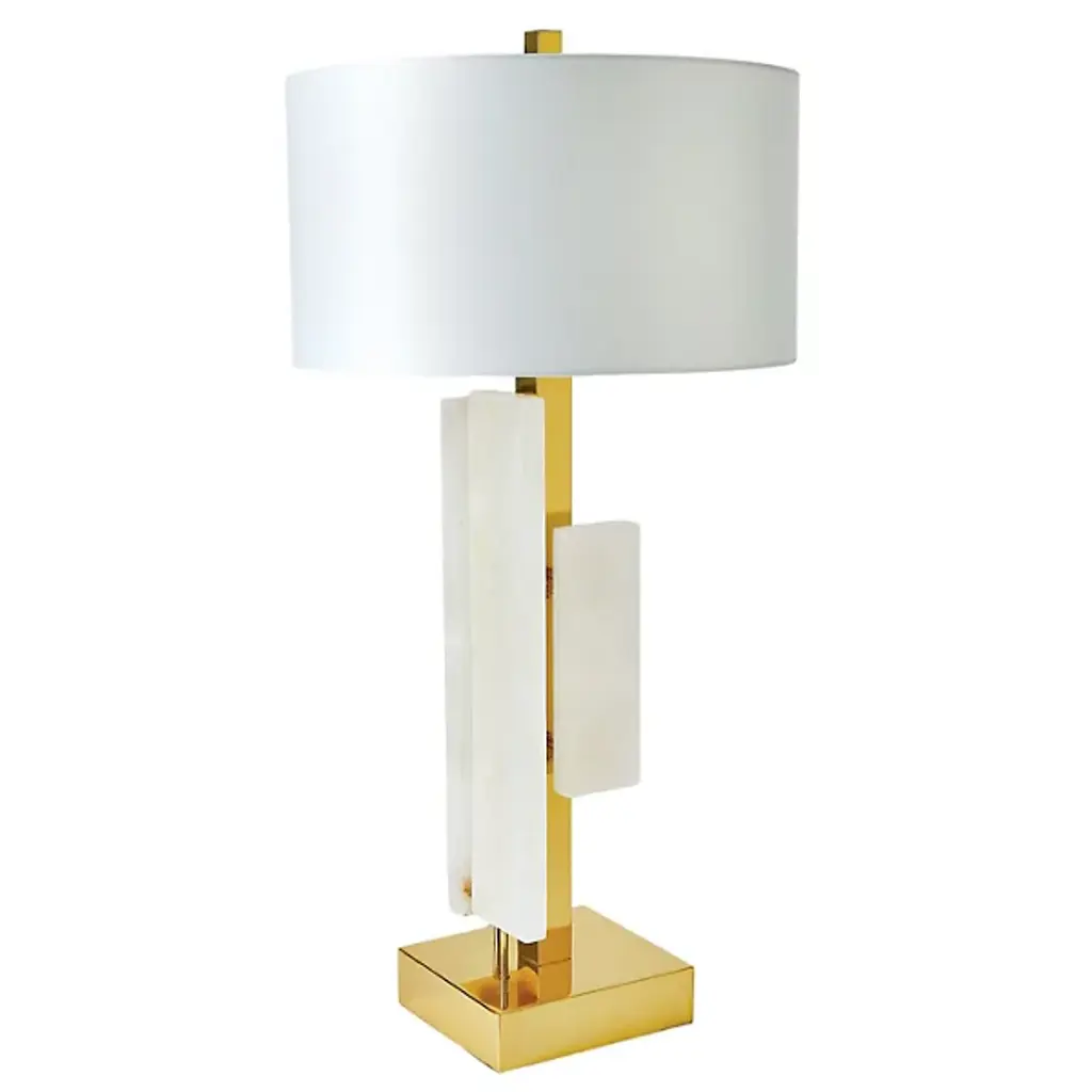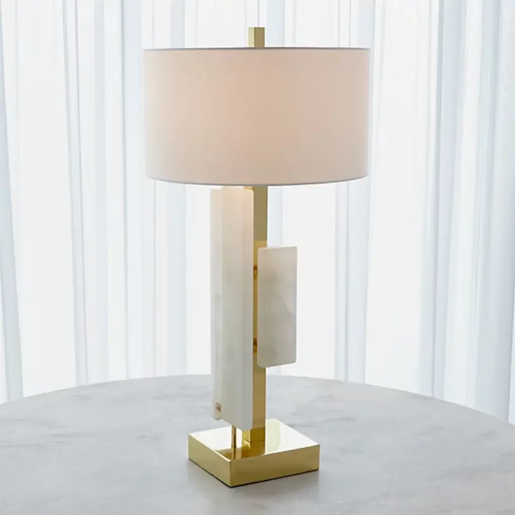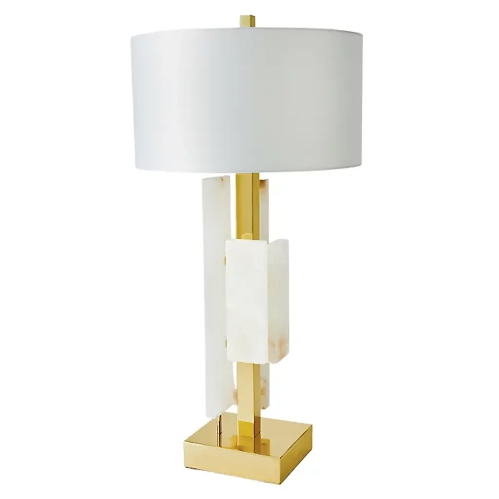 The Posh Block Table Lamp from Global Views is a sophisticated piece featuring a brass base and four striking sheets of alabaster, topped with a hardback fabric shade. As a natural material, alabaster offers unique veining and color variations in every piece, ensuring that each lamp is one of a kind. These inherent differences add to the lamp's charm and individuality, making it a distinctive and personalized addition to your decor, blending elegance and natural beauty seamlessly.