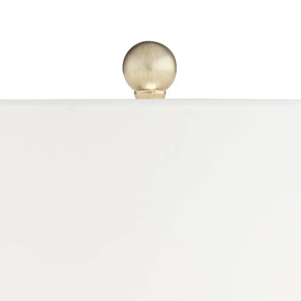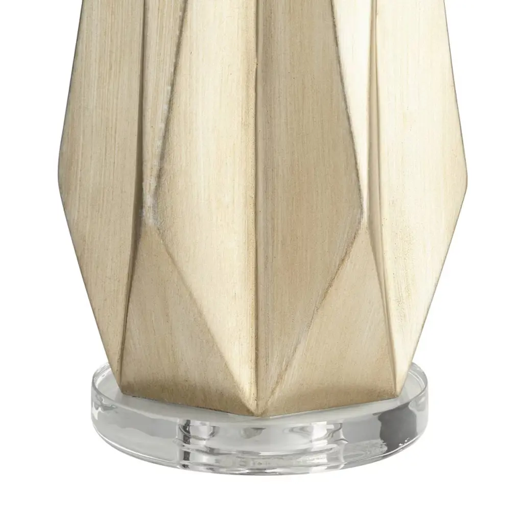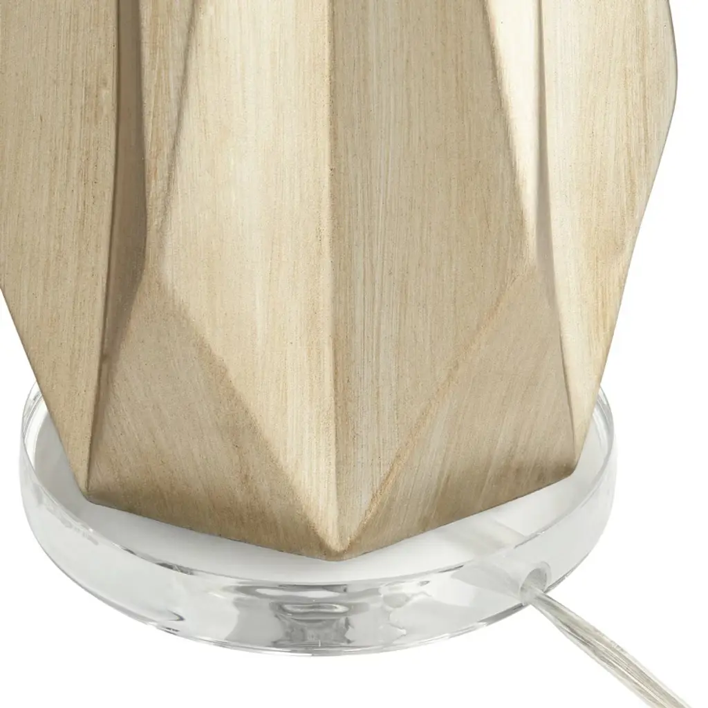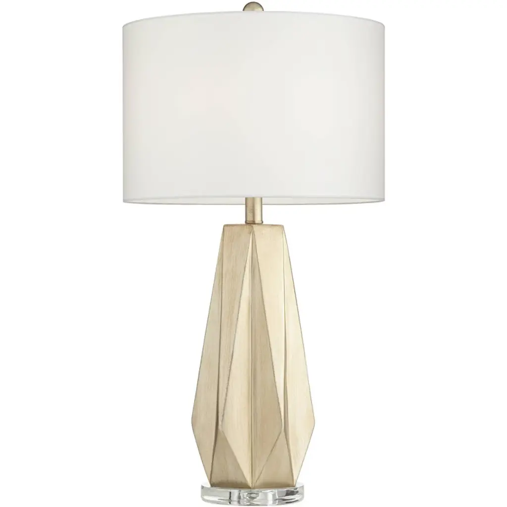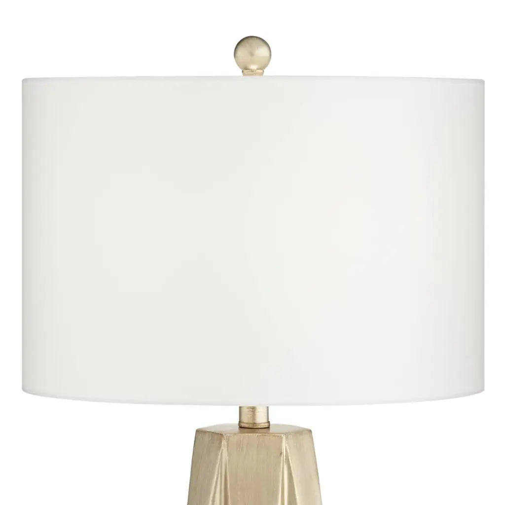 From Possini Euro Design, this set of two modern table lamps offers elegant styling for your bedroom or living room. Each lamp shows off a glimmering champagne finish resin body with diamond shapes cut in for a geometric look. White drum shades create a classic finish touch. This creative design is perfect for a contemporary or transitional setting.