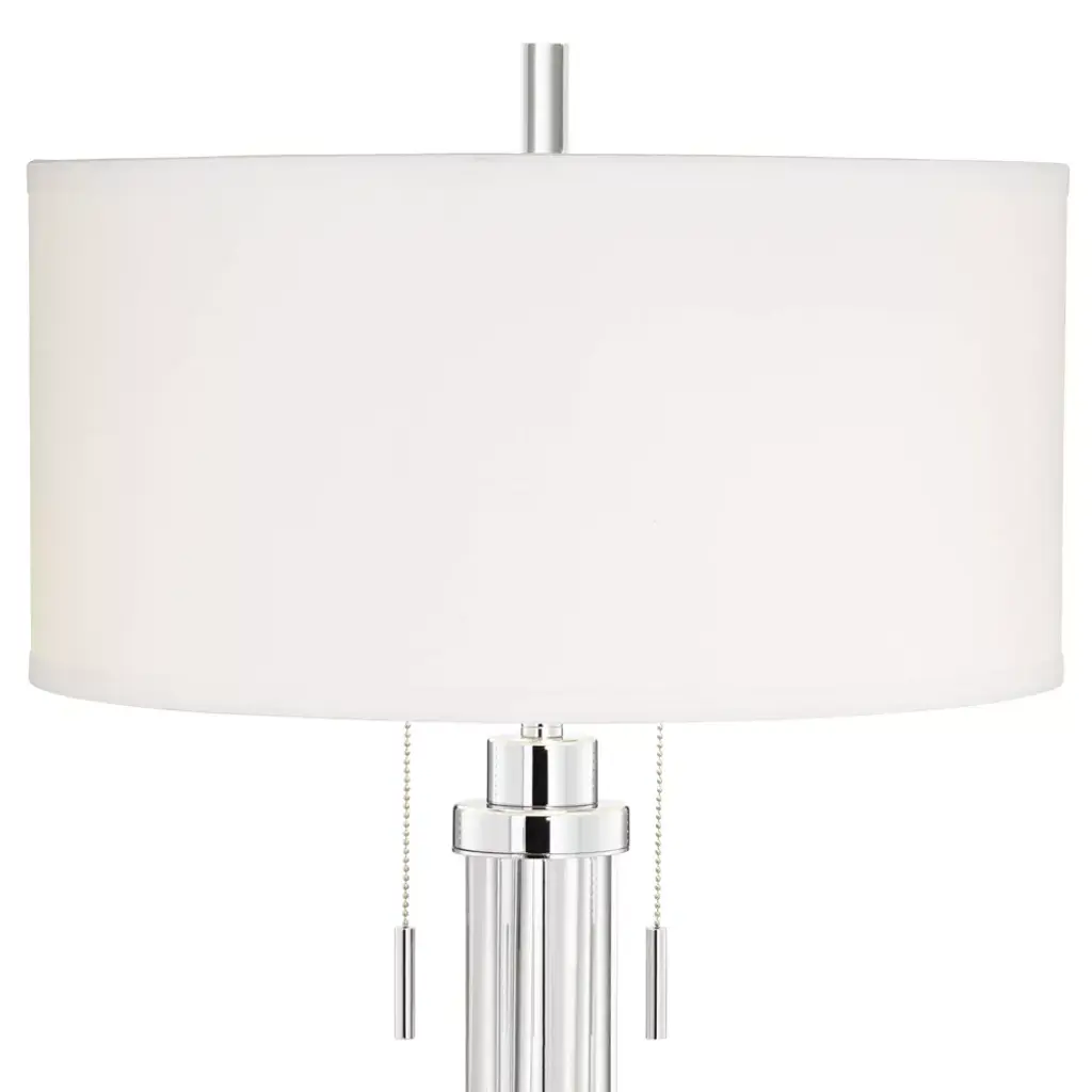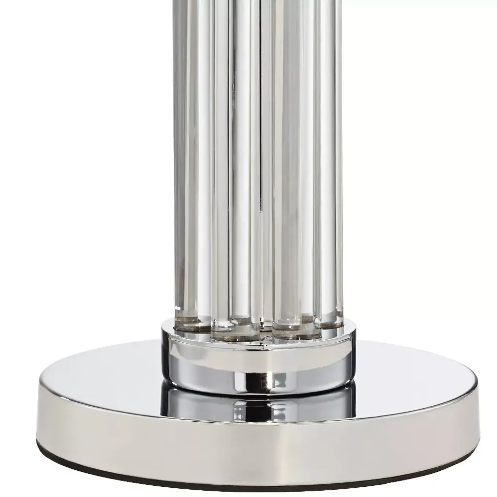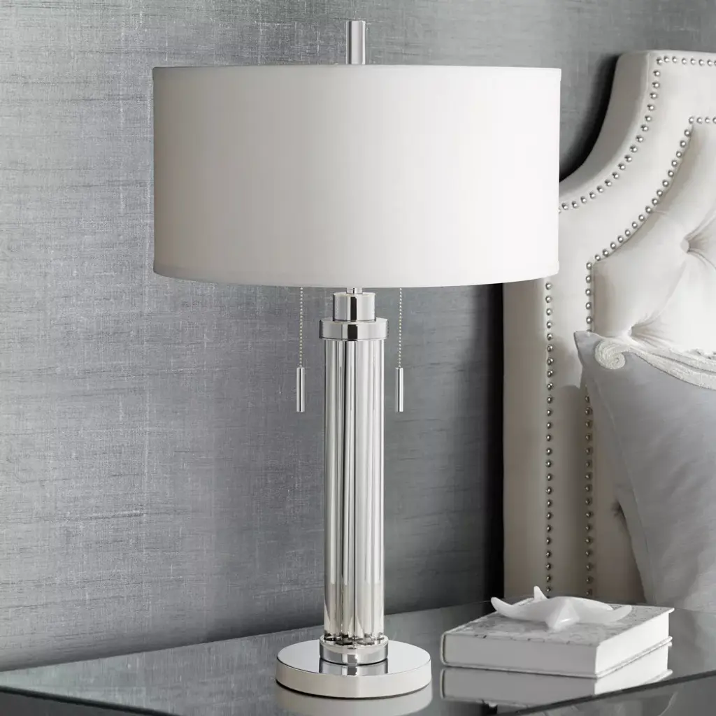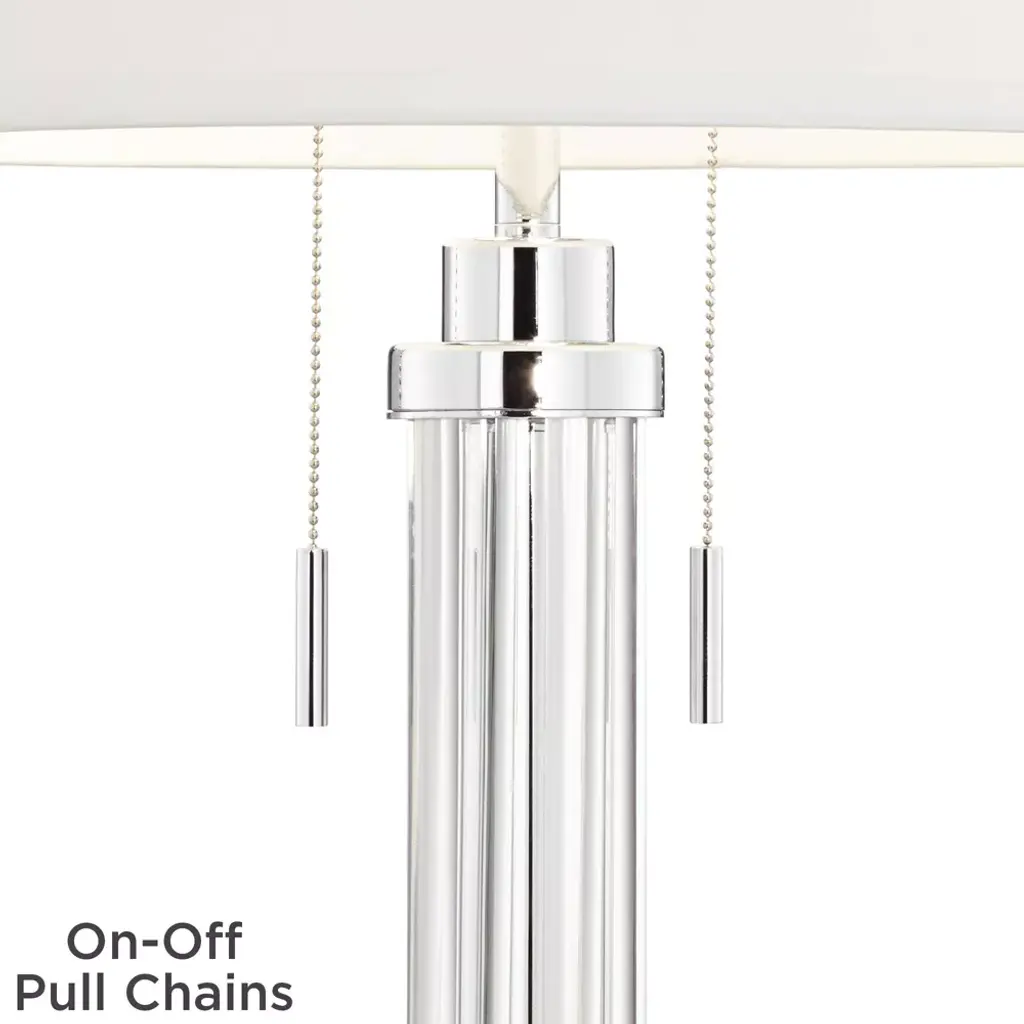 The perfect addition to modern decor, this column table lamp comes from the Possini Euro Design® brand of modern lighting. It features five glass columns rising from a stacked chrome finish metal base upwards to a white crisp linen shade. The light and open look adds designer style to living room lighting plans or to bedroom areas. With two pull chain switches that control the two bulbs and give you easy lighting control.