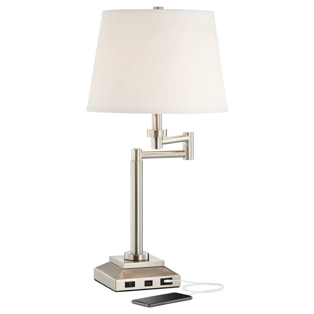 Offering a classy contemporary look, this antique brass desk lamp adds convenience to any living space. With a handy power outlet and USB port built into the base, this lamp makes it easy for you to charge smartphones and other devices. It also comes with an adjustable LED gooseneck arm, allowing for more focused lighting.