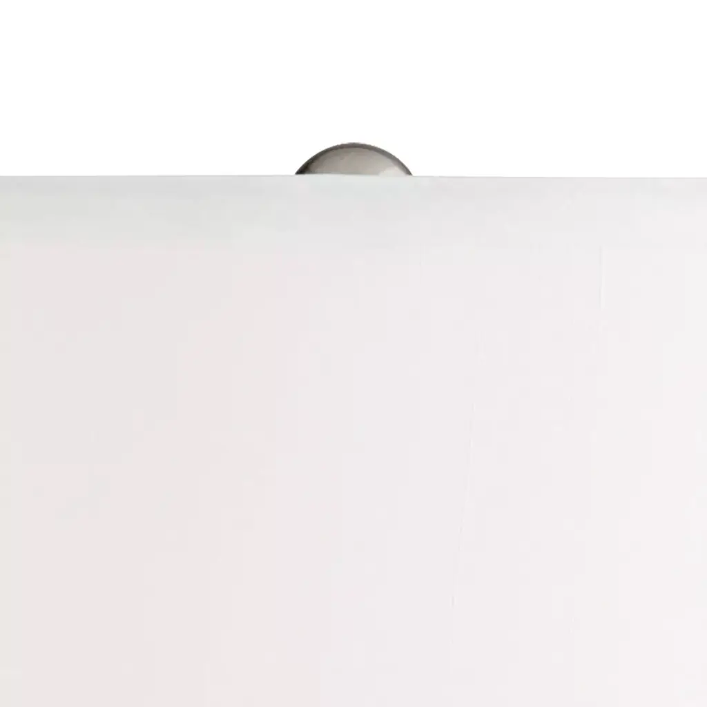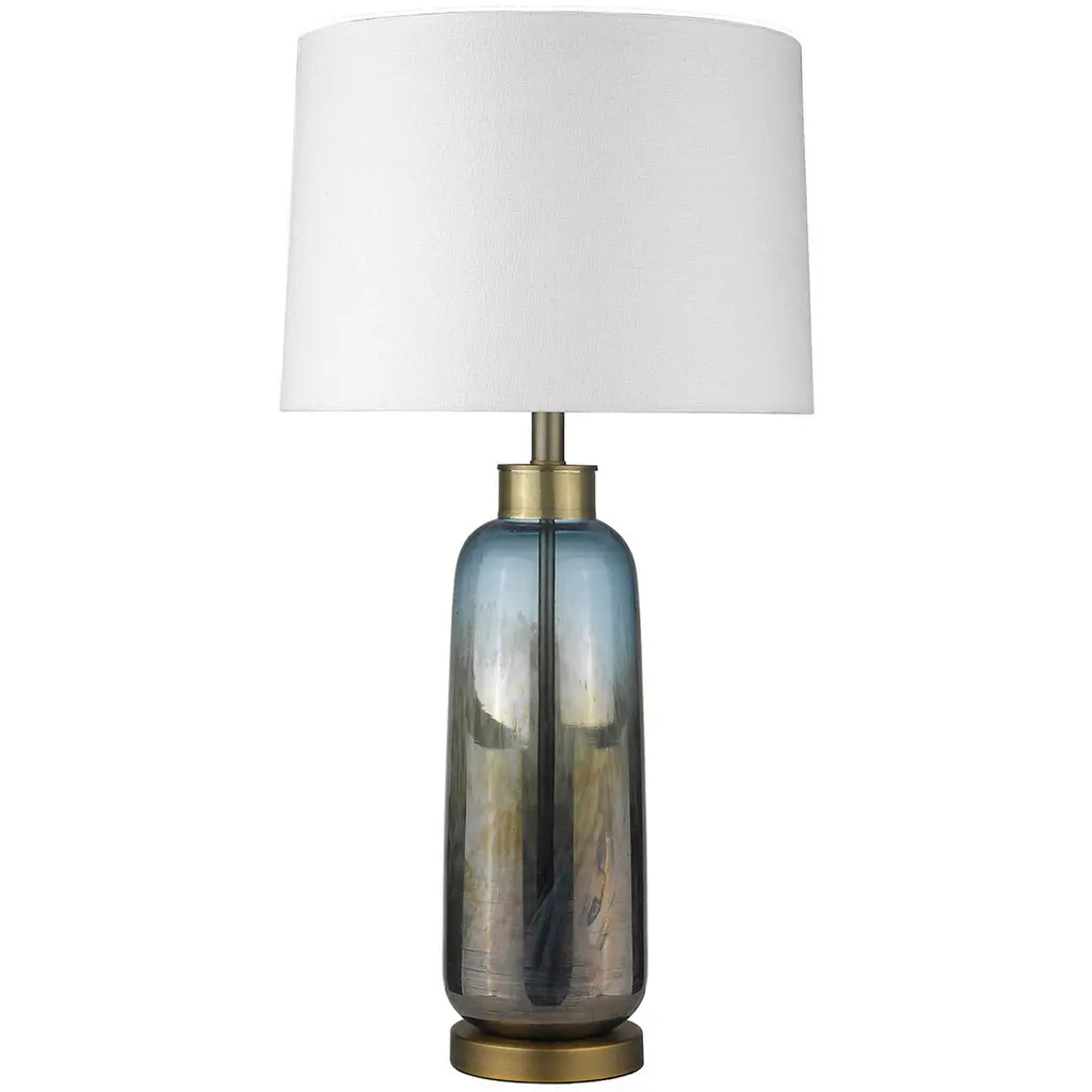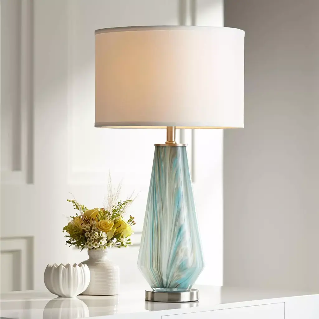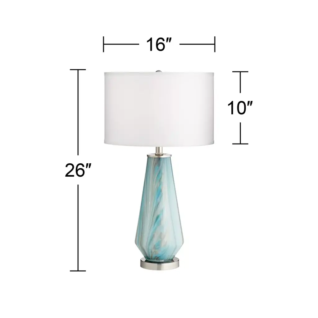 Embracing the artistic side of interior design, this modern table lamp offers a light touch with a delicate blush of color. In a slightly tapering silhouette, the glass body comes in faded swirls of gray and blue, resulting in a softened contemporary modern look for your living space. Brushed nickel finish accents and a white drum shade on top provide a clean and classic touch to this elegant design.