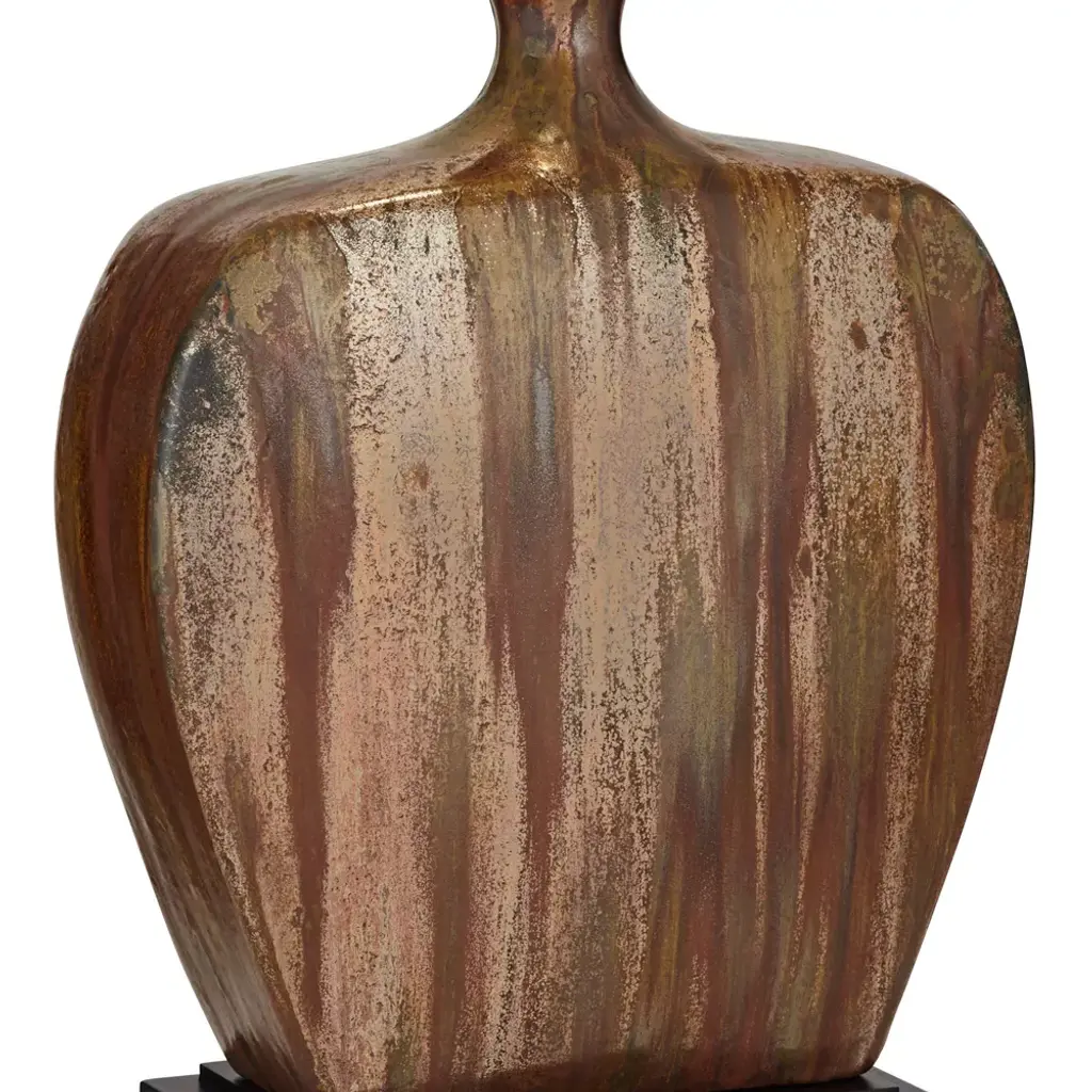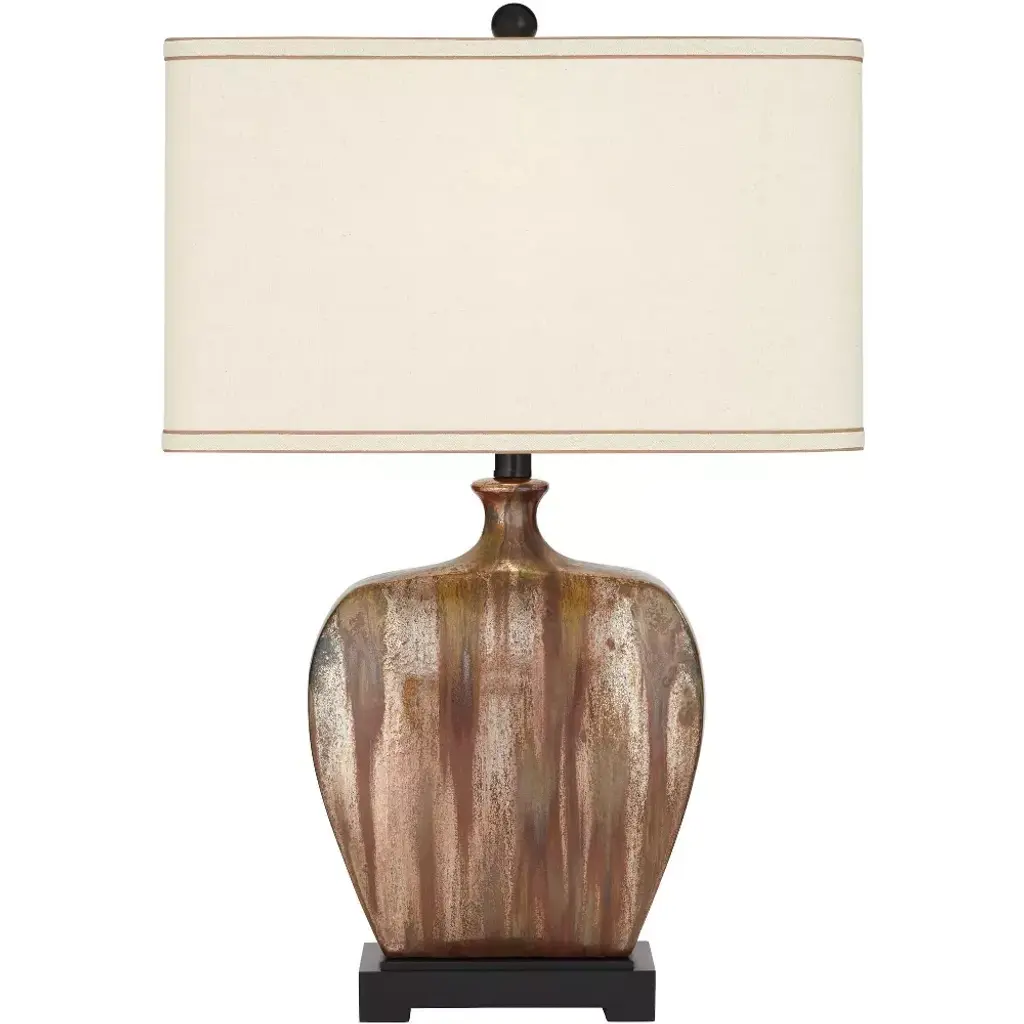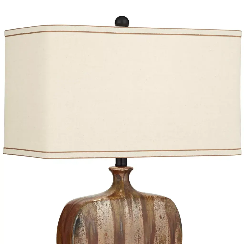 A copper drip finish adds bright color variation in this beautiful set of two ceramic table lamps. Creating a lovely parallel, the rectangular shape is paired with a rectangular shade accented with trim. Versatile enough to fit a variety of decor. Since each ceramic base is handmade, there may be slight variations in pattern and color.