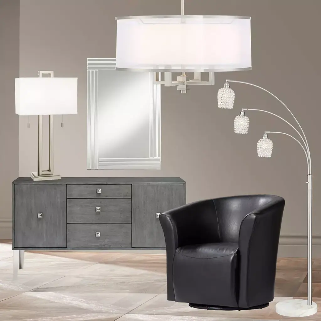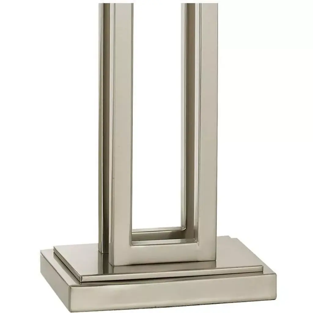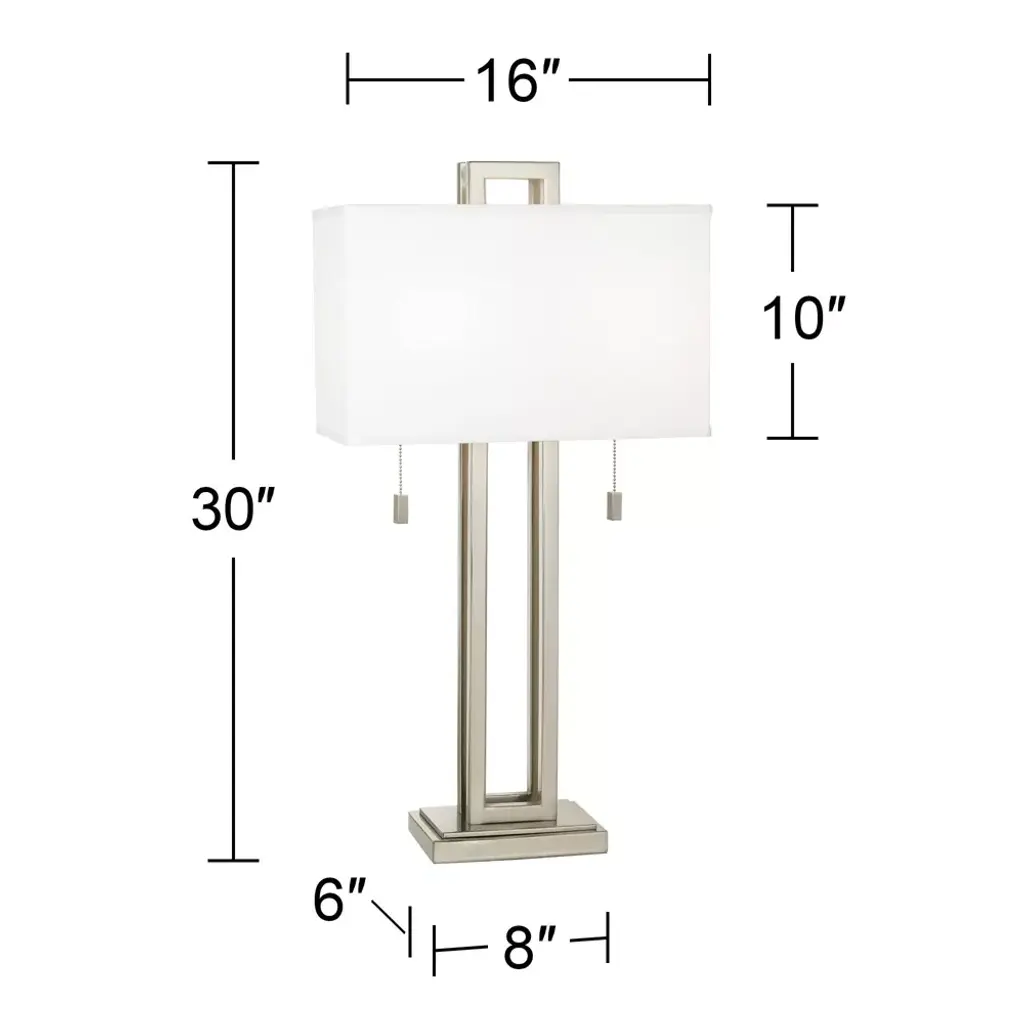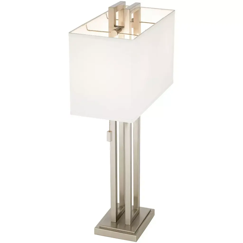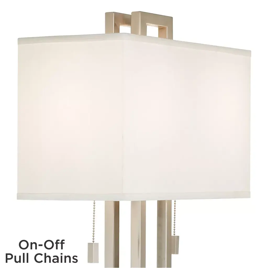 This sleek table lamp has a contemporary look and feel. Features a nickel finish open metal body and a rectangular box shade. Twin on-off pull chains let you control the light output.