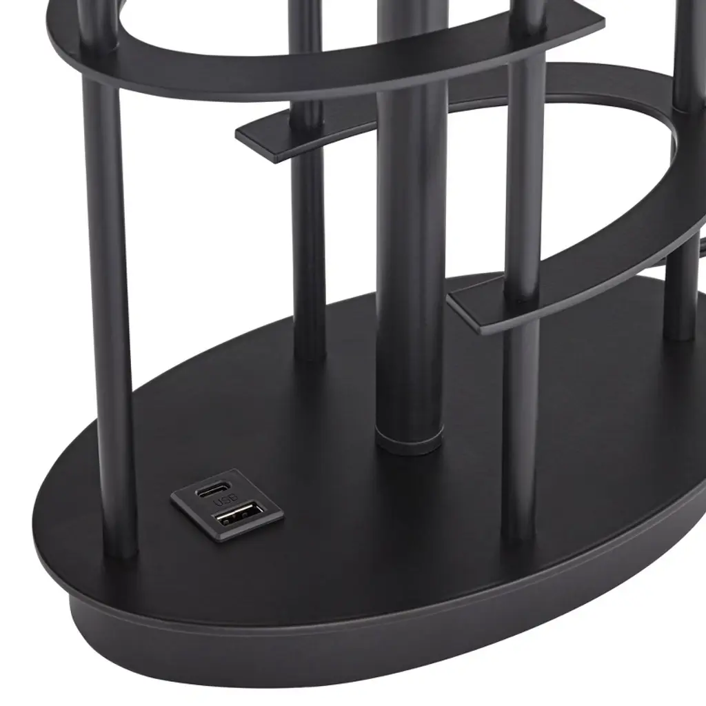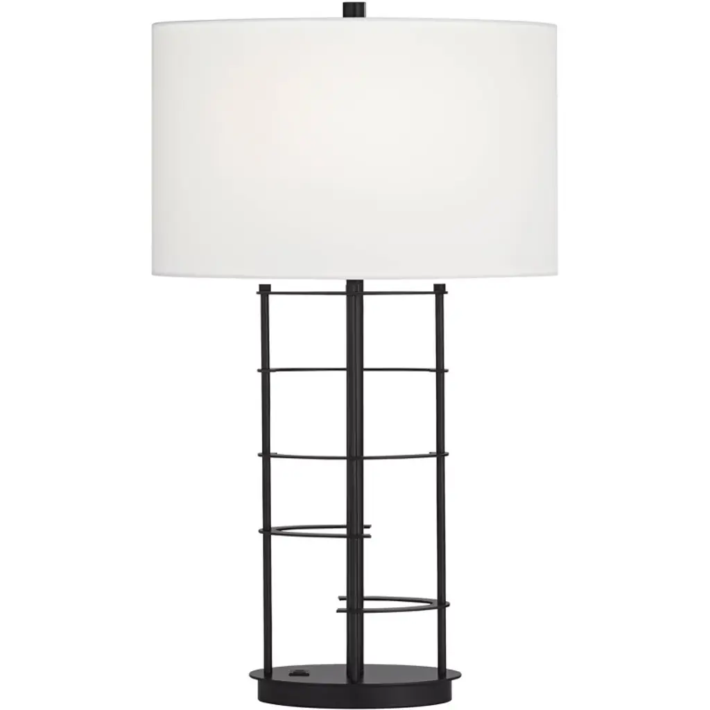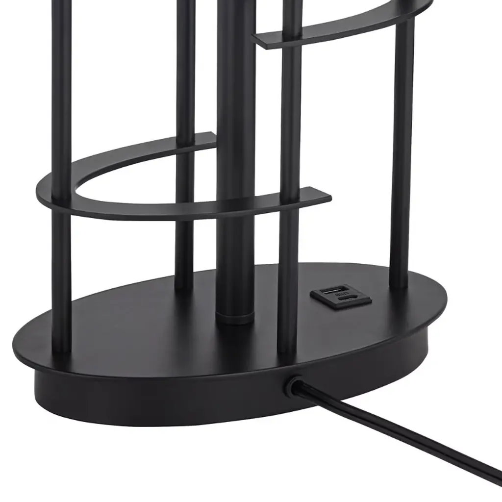 Add bright style and update your living space with this open cage table lamp. From the Possini Euro Design brand of lighting, the lamp comes in a powder-coated black finish over an open metal frame. Twin USB ports in the base allow you to easily charge phones and other electronic devices. Up top is a white linen oval lamp shade for a final design touch.
