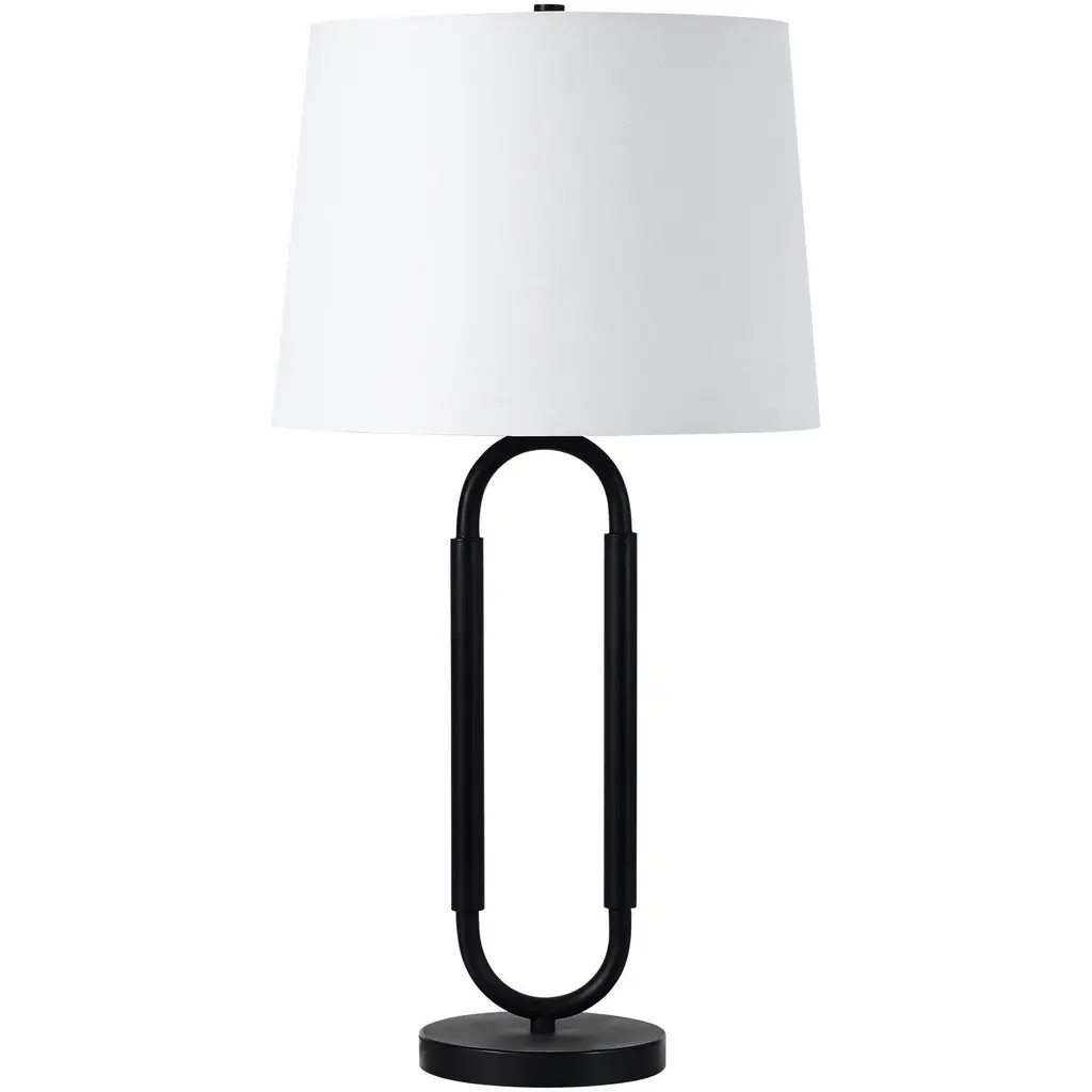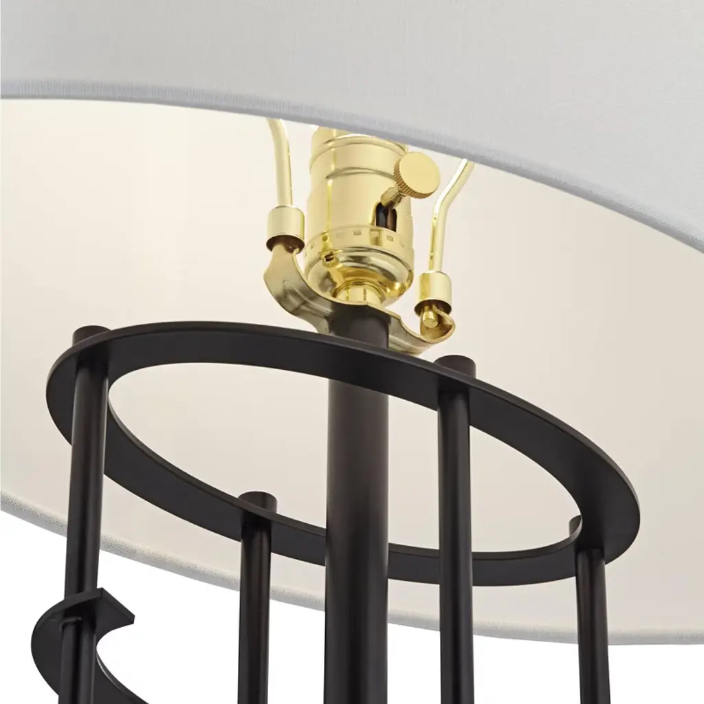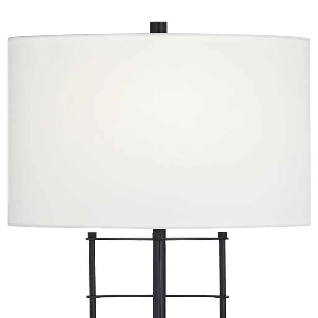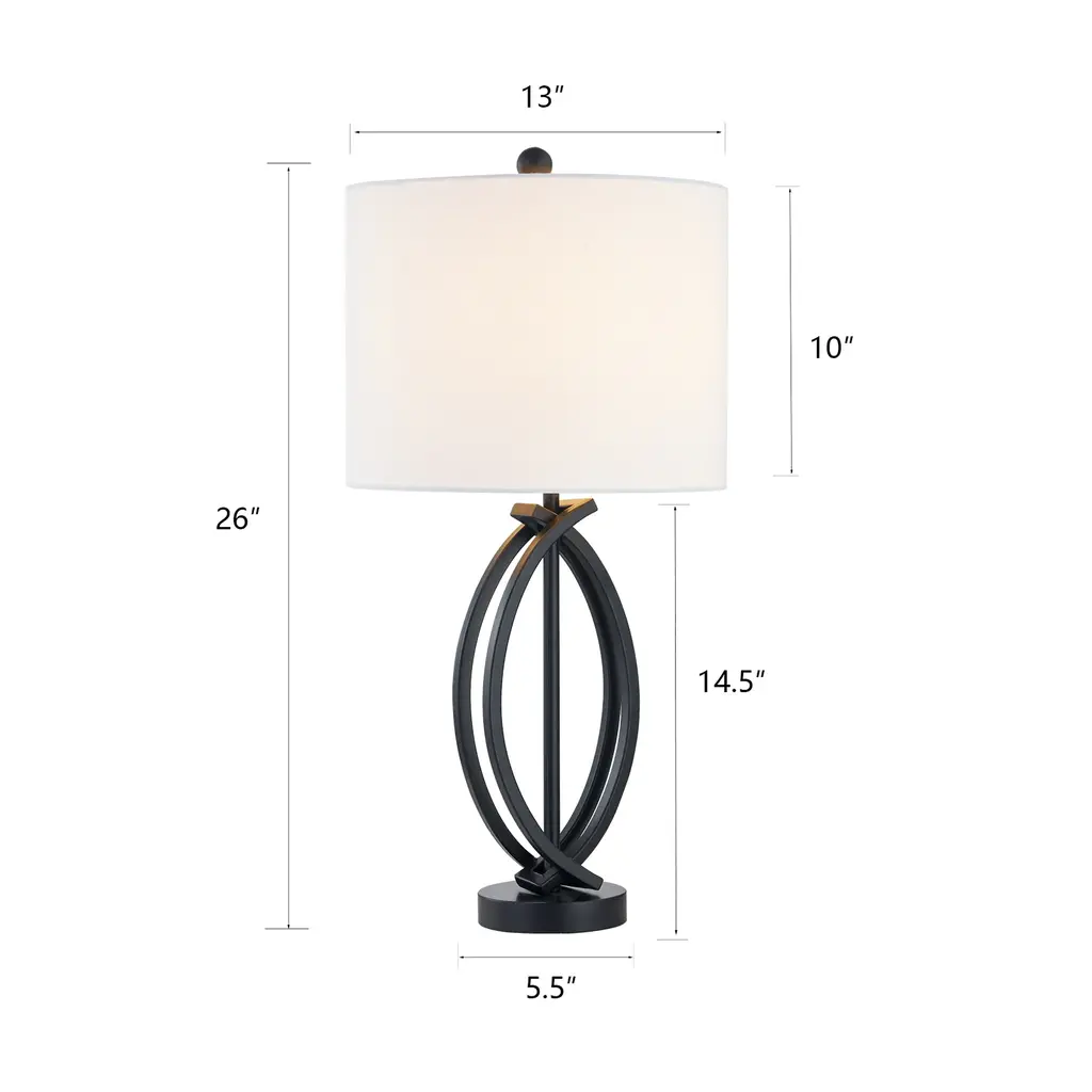 Add bright style and update your living space with this open cage table lamp. From the Possini Euro Design brand of lighting, the lamp comes in a powder-coated black finish over an open metal frame. Twin USB ports in the base allow you to easily charge phones and other electronic devices. Up top is a white linen oval lamp shade for a final design touch.