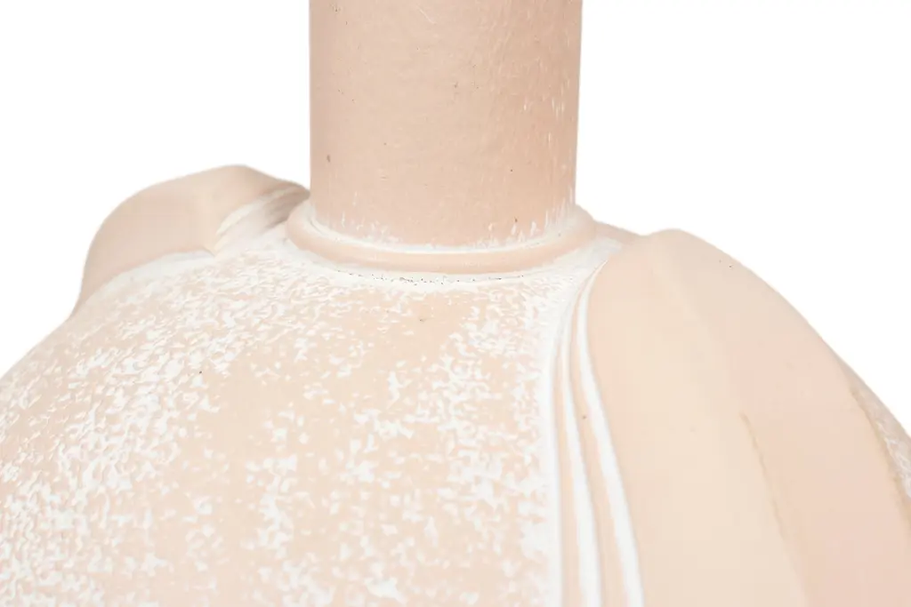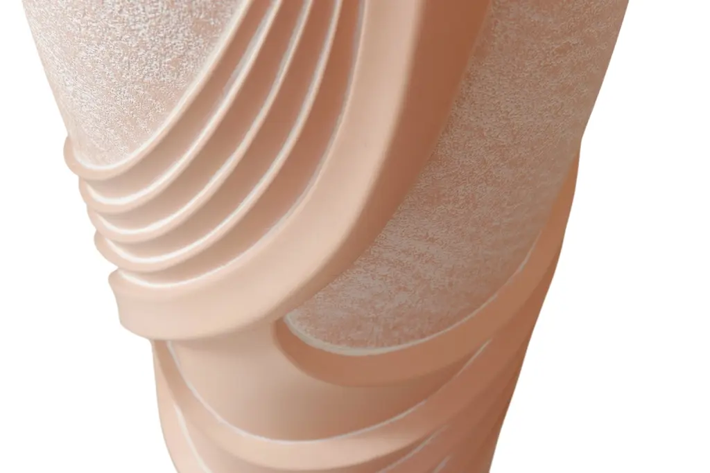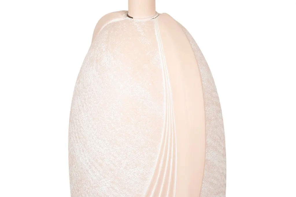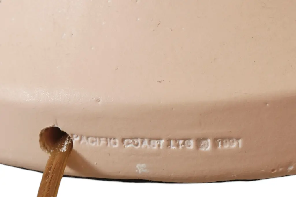 A pair of postmodern lamps by Pacific Coast dated 1991. Postmodern sculptural style vases in peach are cast with flowing folds draped to give the look of fabric. Both the table lamp and the floor lamp come with matching peach ball finials, and are marked and dated with Pacific Coast Ltd 1991 at the base. Floor lamp measures 11"W x 11"D x 49.5"H to top of socket, 60.5"H to top of finial. Table lamp measures 8"W x 8"D x 22.75"H to top of socket, 32"H to top of finial.