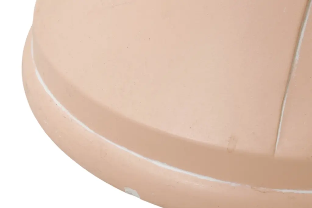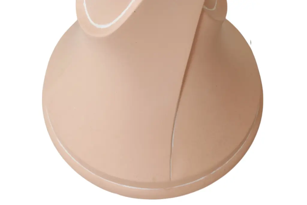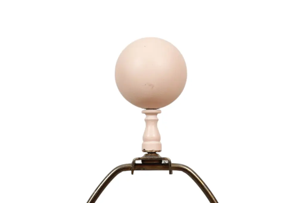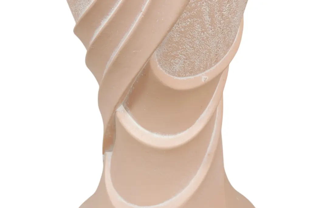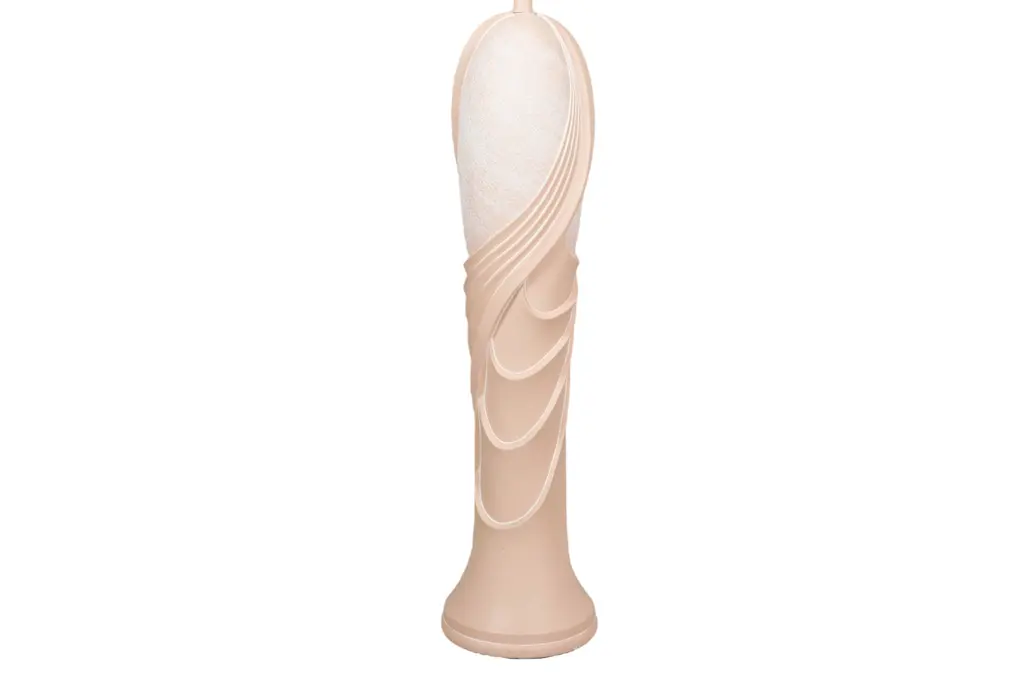 A pair of postmodern lamps by Pacific Coast dated 1991. Postmodern sculptural style vases in peach are cast with flowing folds draped to give the look of fabric. Both the table lamp and the floor lamp come with matching peach ball finials, and are marked and dated with Pacific Coast Ltd 1991 at the base. Floor lamp measures 11"W x 11"D x 49.5"H to top of socket, 60.5"H to top of finial. Table lamp measures 8"W x 8"D x 22.75"H to top of socket, 32"H to top of finial.