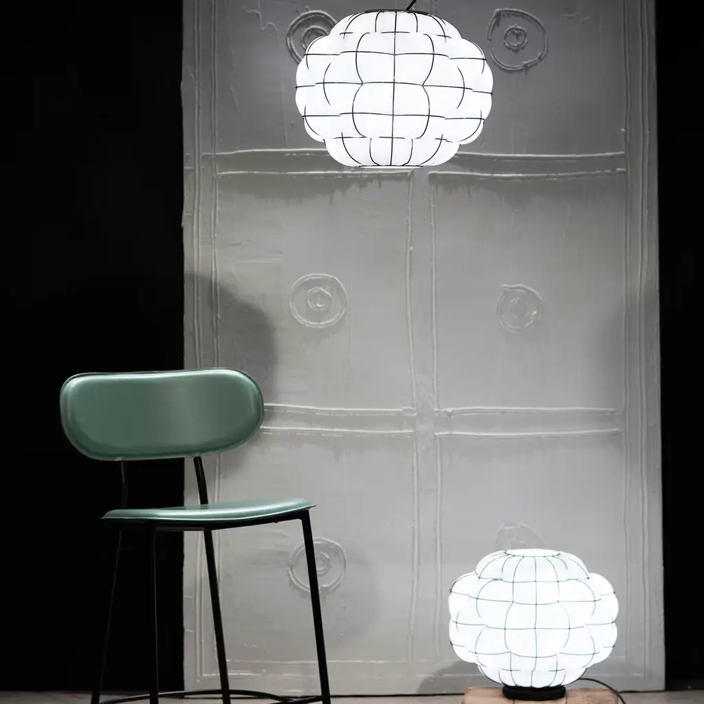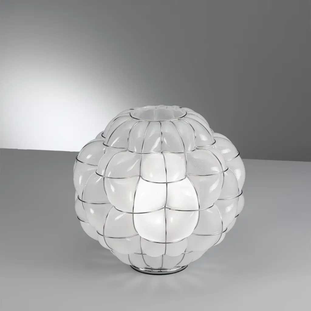 This glamorous table lamp is an ode to Murano glassblowing tradition and artisans, who deftly blow every single piece to reveal unpredictable details that make each piece truly unique. The triumph of curves distinguishing the stainless steel cage creates a voluminous, almost tufted design when the glass swells up under the artist's blow, revealing the magic of an ancient tradition that still amazes to this day. Due to handcrafting, slight changes in metal's finish may occur.