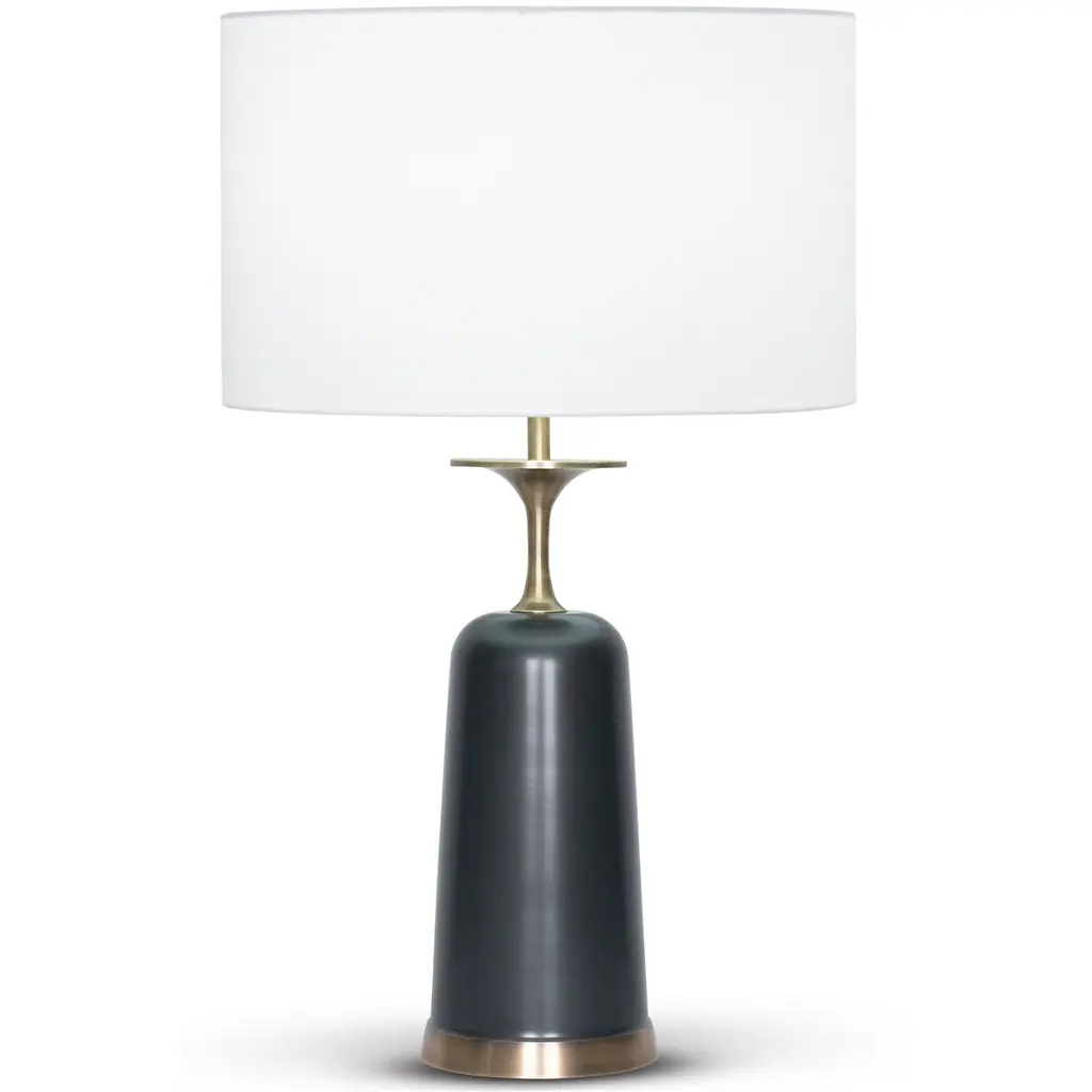 Port 68 Powell mid century style lamp featuring solid wood and aged brass metal neck. Cylinder shaped aged brass finial. Polyester shade dimensions: 19"Dia. x 11"T. Round drum hardback shade with soft rolled edge trim. Uses one 100-watt bulb. S-socket with high-low line switch. Overall: 19"D x 3"T. Cord length: 6 ft. Imported. Boxed weight, approximately 20 lbs. Ships via UPS Free shipping in the U.S.