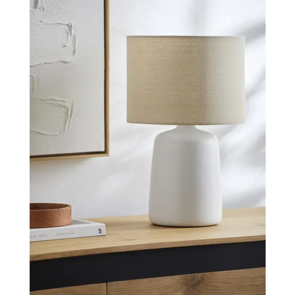 Illuminate your living space with the Pramit accent table lamp, an embodiment of minimalist modern style. The sleek ceramic body of the lamp is complemented by a charming linen shade on the outside and a polyester lining inside, creating a warm and inviting glow. Standing at 16 inches tall, this lamp is perfect for enhancing any corner of your room with its chic and contemporary design. Maintaining its pristine look is effortless - all it needs is a quick wipe with a dry cloth to keep it clean. However, remember to steer clear of harsh cleaners as they could potentially harm the beautiful finish. This Pramit accent table lamp will undoubtedly add an elegant touch to your decor while offering functional lighting solutions.