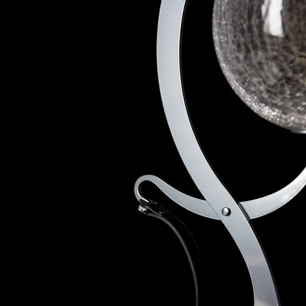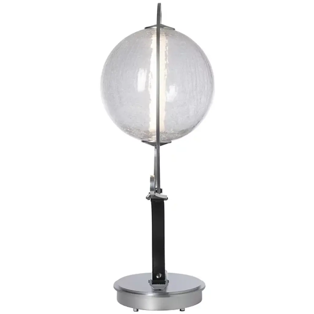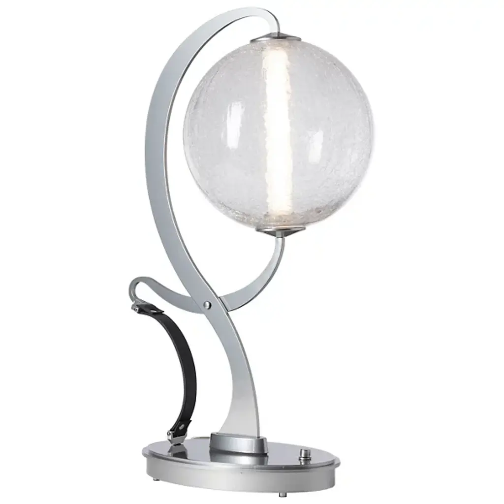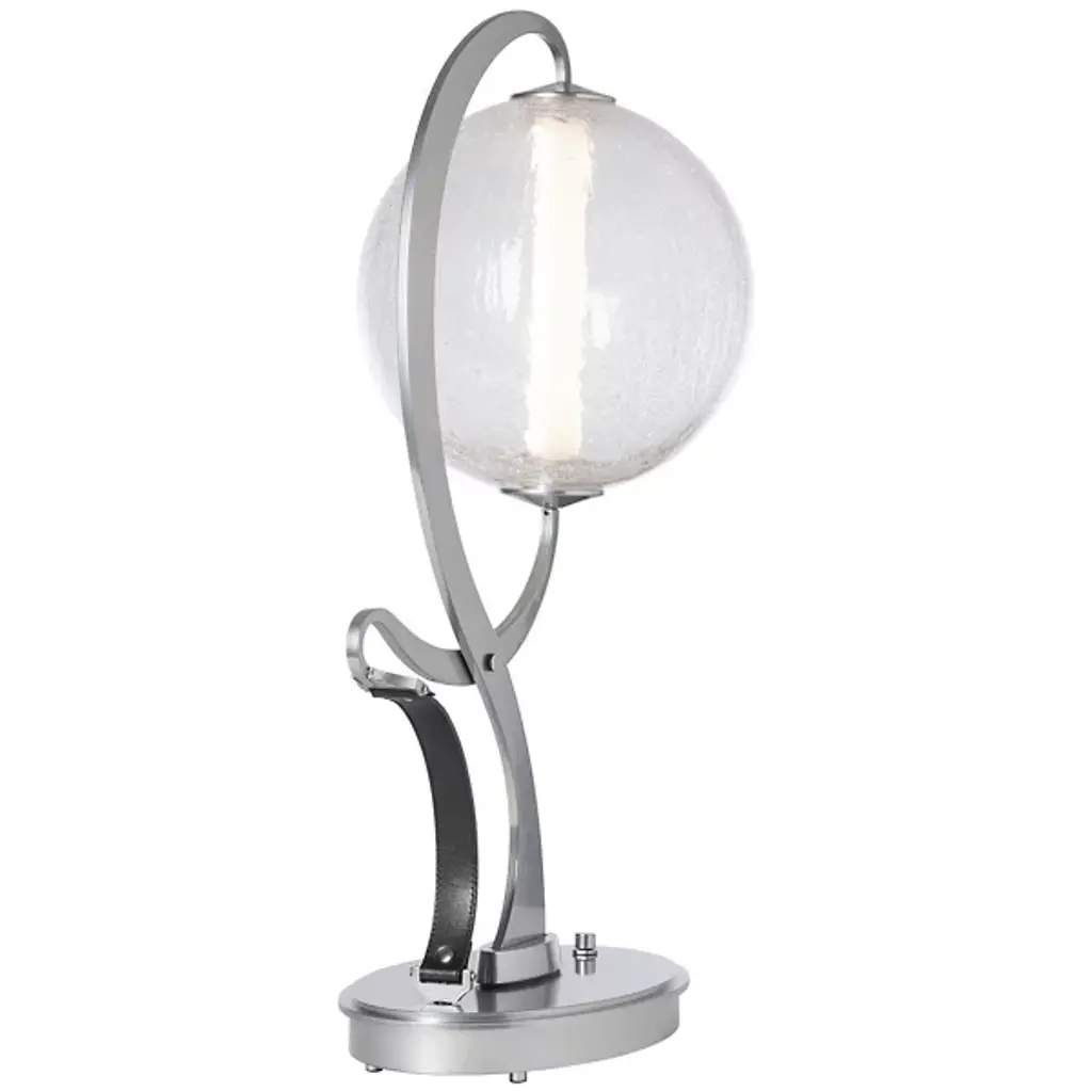 A touch of the fantastical for a modern desktop or side table. The Pression LED Table Lamp by Hubbardton Forge is at once dramatic, whimsical and technologically innovative. Curved steel “tongs” support the glass globe shade at the top and bottom, and they also provide the power needed to illuminate the LED light tube housed within. A leather strap accent curves from the lower arm to the base and adds a pleasingly unexpected textural element.