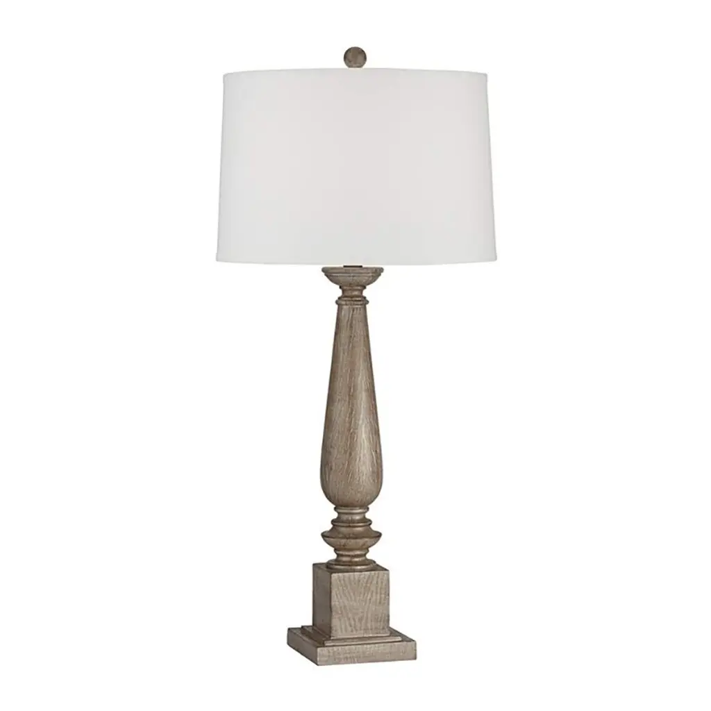 32 3/4" high overall. Shade only is 14" across the top x 15" across the bottom x 10" high. Uses one maximum 150 watt standard-medium base bulb (not included). On-off socket switch. Candlestick style lamp Base is in a fax light oak wood finish. Crafted from cast resin. Off-white linen shade. 8-foot long cord. Brighten a living room or seating area with the warm style of this candlestick style lamp. The design features a faux wood pedestal column crafted in a light oak finish. An off-white linen shade is on top. It's a wonderful look for farmhouse or traditional decorating.