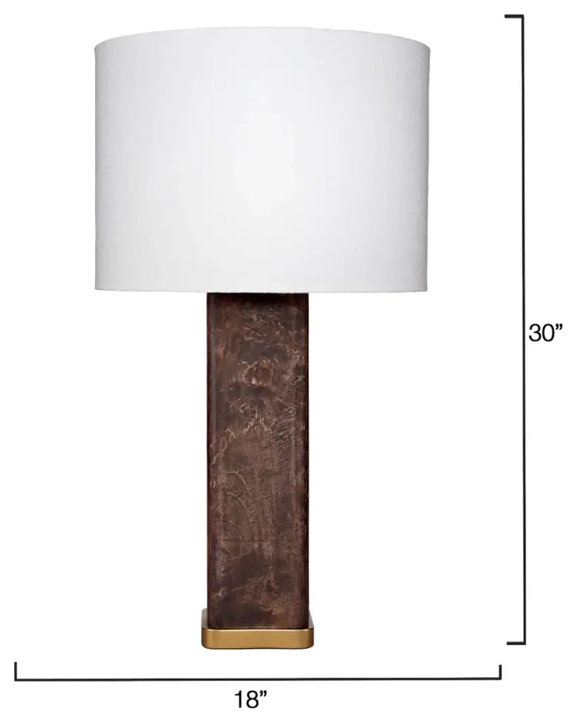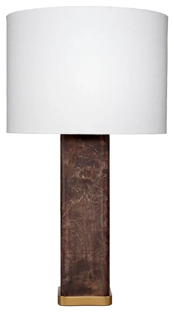 A simple, square body creates a clean canvas for the opulence of rich, luminous burl veneer. Touches of antiqued brass in its rounded rectangular finial and base provide additional warmth. The lamp is topped with a clean white drum shade in slubbed linen. This is a wonderful choice to brighten a home office or den!Handmade of Burl WoodDrum, 100% White Linen Slub Shade, Rolled EdgeMetal Base in Antique Brass, 1"H x 6"W x 6"D1.25" Rounded Rectangle Antique Brass Finial9" Brass Harp, Brass SpiderThe handcrafted nature of burl wood creates products with character and individuality. The inherent knots, grains, and variations in tone and texture are preserved, to create pieces rich in detail and natural beauty. These unique imperfections and variations are what define our products, with each piece having its own personality. Lamp Body Dimensions: 23"H x 6"W x 6"DShade Dimensions: 13"H x 18"W x 18"D1 Bulb required; Bulb not included150 Max Wattage, Volts 220 E26 Bulb Base Type8 FT Clear Cord3-Way Switch on SocketProtective Brown FeltNot Damp RatedCare Instructions: We do not recommend using harsh or abrasive cleaners at any time as they can damage product. Wipe surfaces gently with soft, dry cloth. If needed, you may use a lightly damp cloth with water only on base.