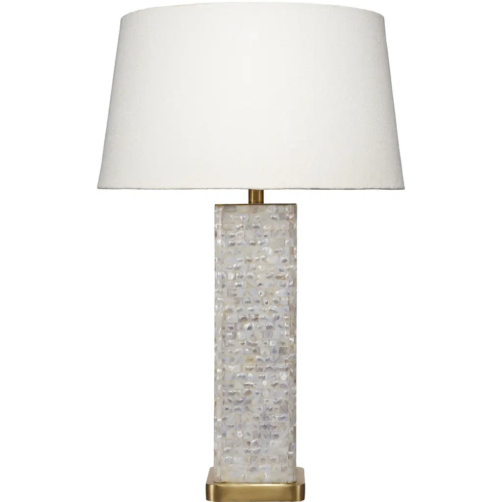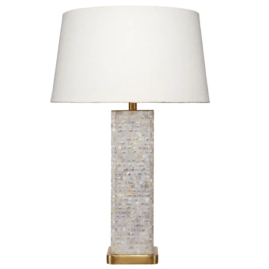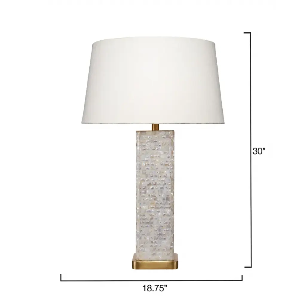A simple, square body creates a clean canvas for the opulence of rich, luminous mother of pearl. Touches of antiqued brass in the lamp's rounded rectangular finial and base provide additional warmth. The lamp is topped with a clean white drum shade in slubbed linen. This is a wonderful choice to brighten a home office or den!