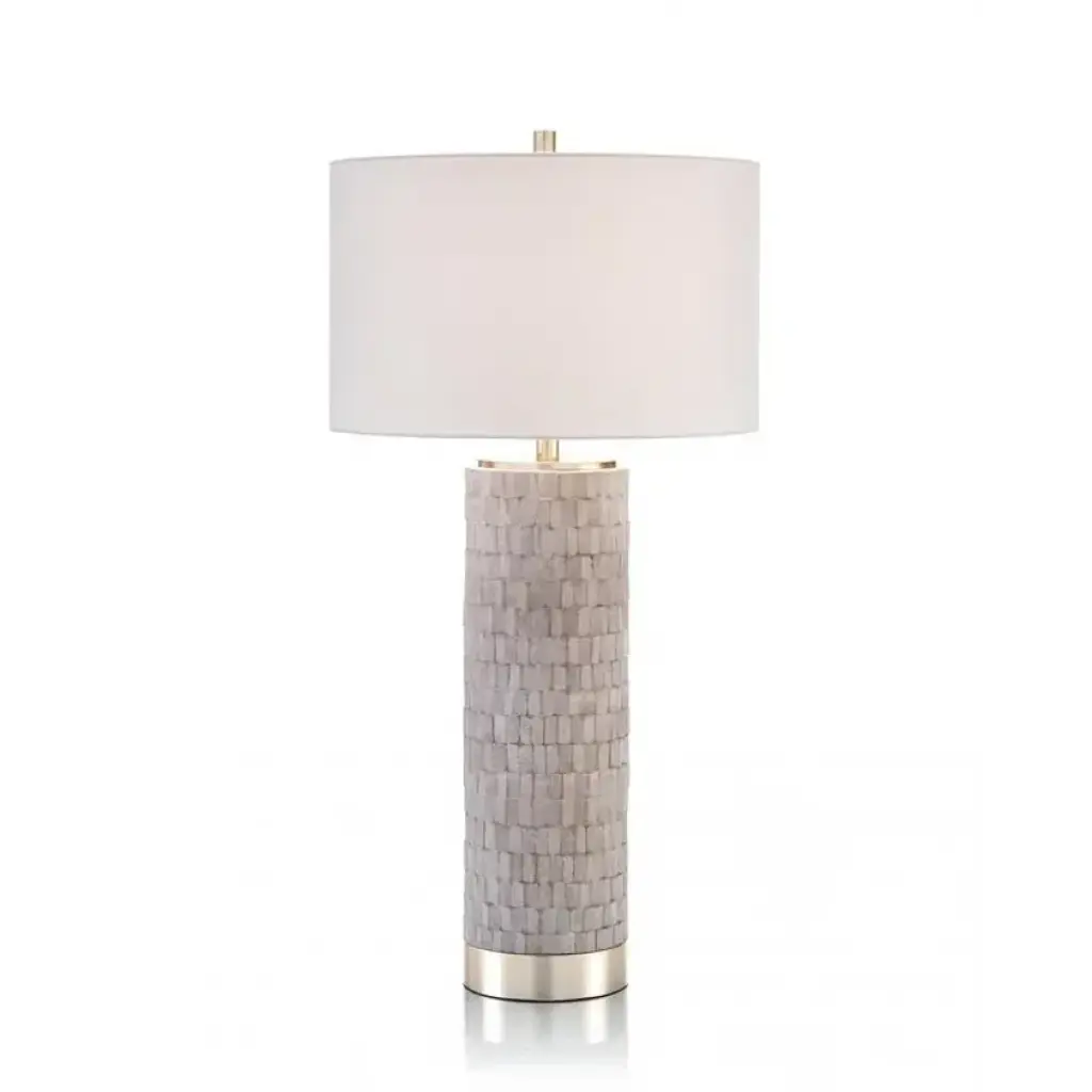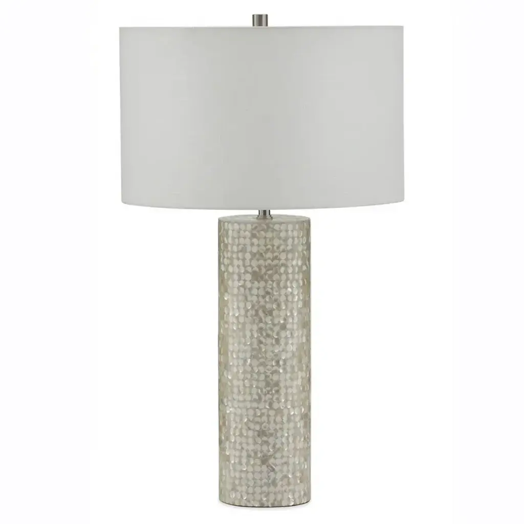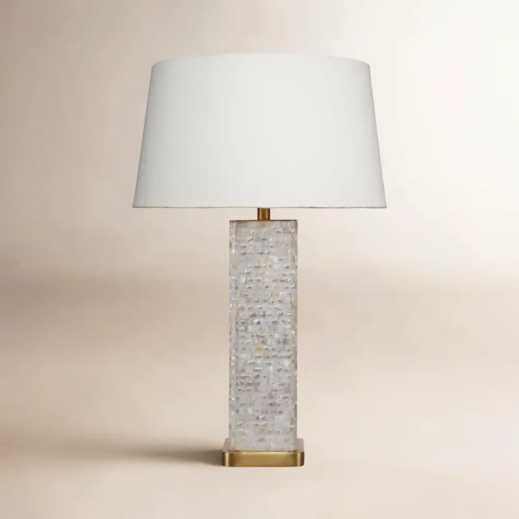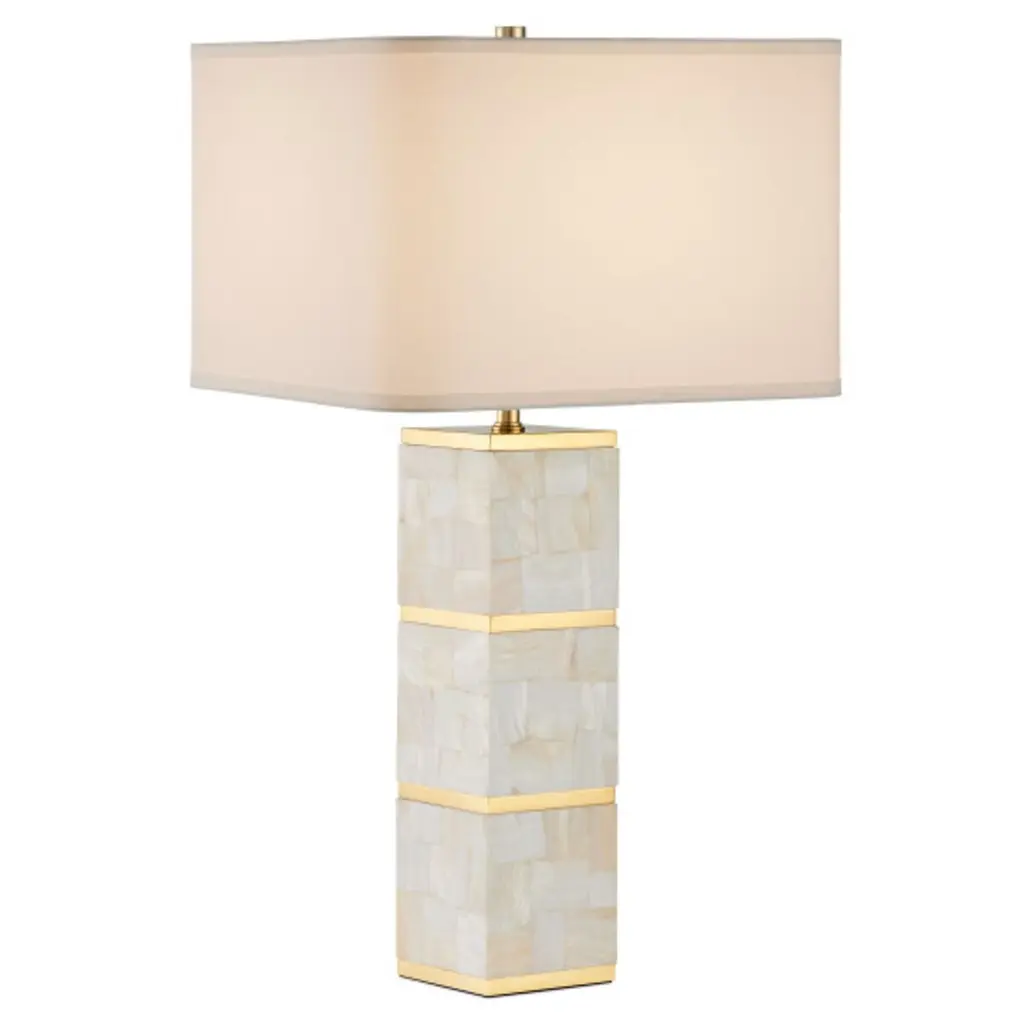 A simple, square body creates a clean canvas for the opulence of rich, luminous mother of pearl. Touches of antiqued brass in the lamp's rounded rectangular finial and base provide additional warmth. The lamp is topped with a clean white drum shade in slubbed linen. This is a wonderful choice to brighten a home office or den!