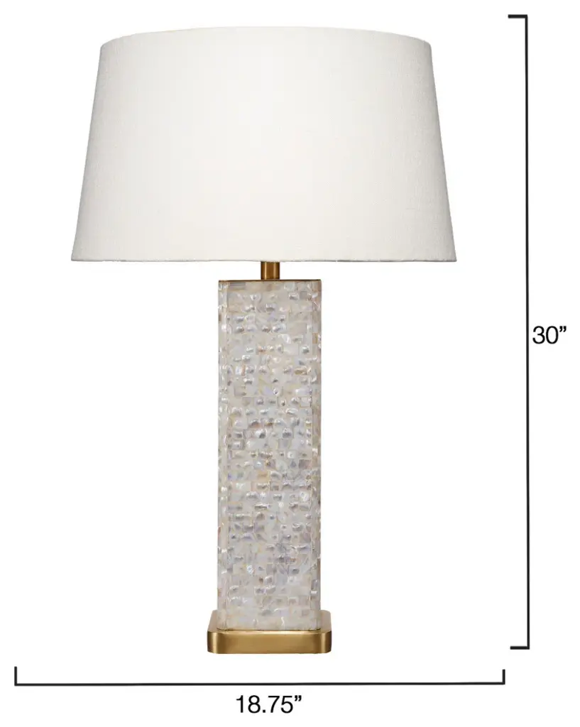 A simple, square body creates a clean canvas for the opulence of rich, luminous mother of pearl. Touches of antiqued brass in the lamp''s rounded rectangular finial and base provide additional warmth. The lamp is topped with a clean white drum shade in slubbed linen. This is a wonderful choice to brighten a home office or den!Handcrafted of natural Mother of PearlTapered Drum, 100% White Linen Slub Shade, Rolled EdgeMetal Base in Antique Brass, 1"H x 6"W x 6"D1.25" Rounded Rectangle Antique Brass Finial9" Brass Harp, Brass SpiderMother of pearl is the iridescent substance that forms the lining of the shells found in both fresh water and salt water mollusks. The inherent variations in tone and texture found in Mother of Pearl are preserved, to create pieces rich in detail and natural beauty. These unique imperfections give our products character and individuality, with each piece having its own personality. Lamp Body Dimensions: 23"H x 6''W x 6"DShade Dimensions: 10.50"H x 18.75"W x 18.75"D, Top Diameter 16"1 Bulb required; Bulb not included60 Max Wattage, Volts 120 E26 Bulb Base Type8 FT Clear Cord3-Way Switch on SocketProtective Black FeltNot Damp RatedCare Instructions: We do not recommend using harsh or abrasive cleaners at any time as they can damage product. Wipe surfaces gently with soft, dry cloth. If needed, you may use a lightly damp cloth with water only on base.