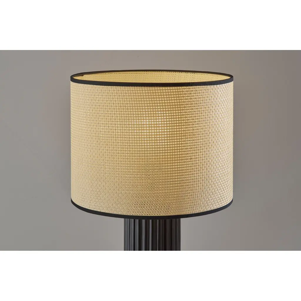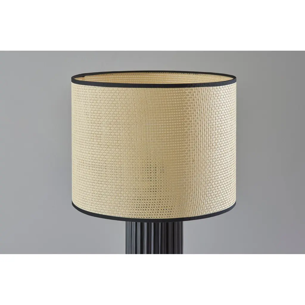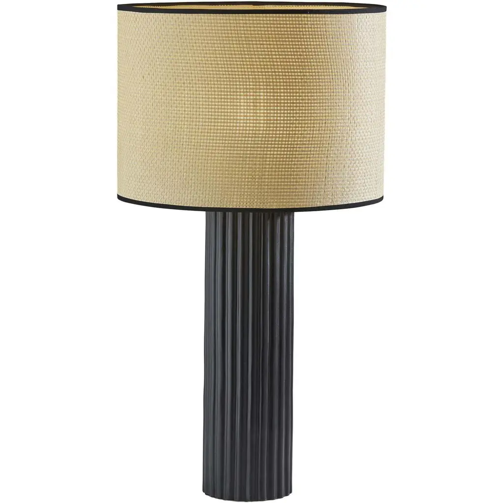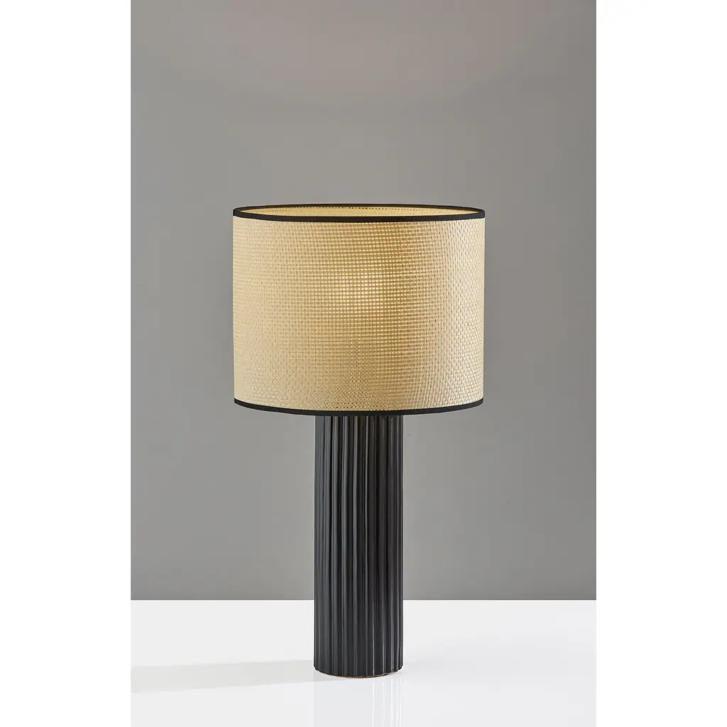 Add easy elegance to your home with the natural materials and subtle embellishments of the 24" tall Primrose table lamp. A natural woven drum shade adds texture and tops a tall, round black ceramic base featuring ribbed detailing. The woven shade softly disperses the light from a 100W bulb and is trimmed in black or white fabric along the top and bottom to complement the ceramic base. Easily operated by a 3-way rotary socket switch, you can adjust the brightness between low, medium, and high to suit your lighting needs. For a pop of color, this lamp is also available with a cornflower blue base, and both color options are offered in a larger, 29" tall size for the perfect lighting solution to any space.