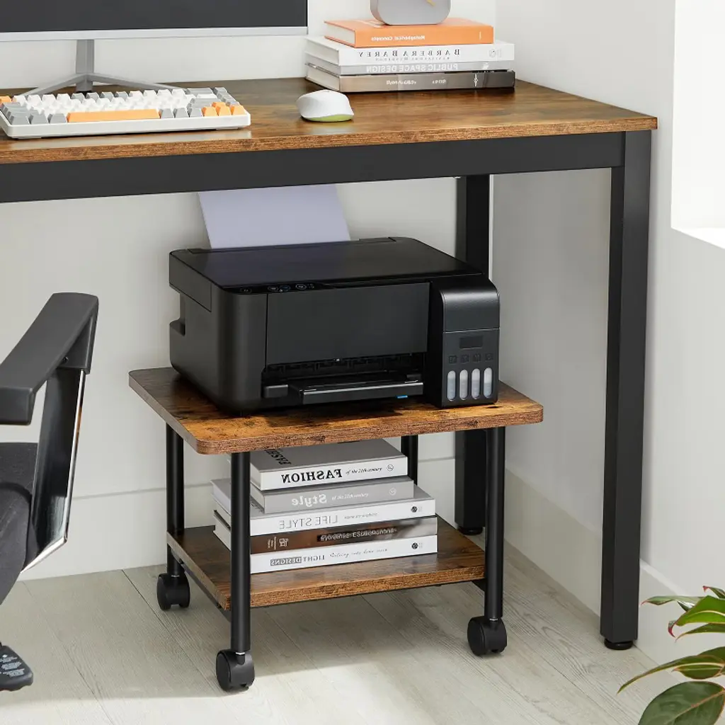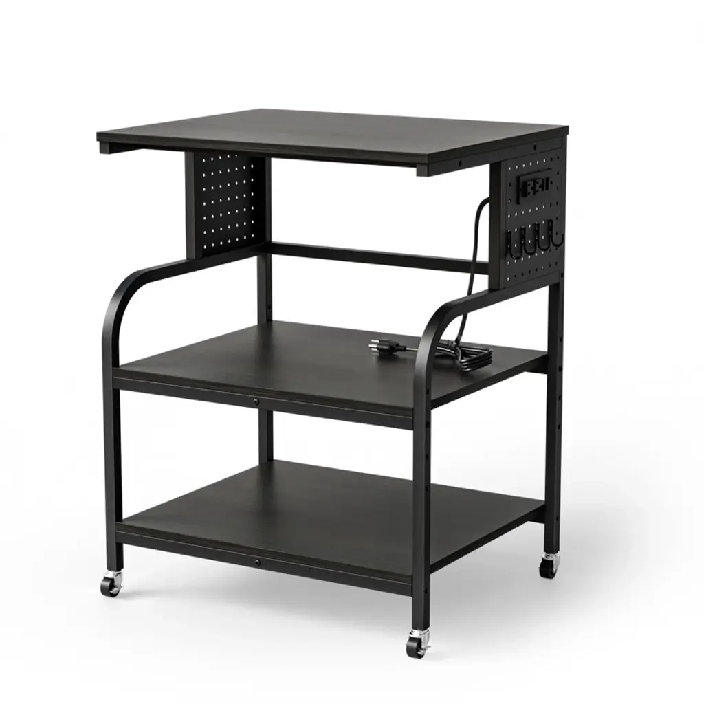 1.Integrated Charging Hub: 2 Outlets + 2 USB Ports for Clutter-Free Power This printer stand doubles as a convenient charging center, eliminating the hassle of tangled cords and limited wall outlets in your workspace. It features 2 standard AC power outlets (perfect for powering printers, scanners, or small desktop computers) and 2 USB ports (ideal for charging smartphones, tablets, wireless keyboards, or Bluetooth headsets)¡ªall neatly integrated into the design for easy access. The 6.5-foot extra-long power cord adds flexibility, letting you place the stand anywhere in your home office, living room, or bedroom without being restricted by nearby outlets. By centralizing power for all your devices, it keeps your workspace tidy, reduces tripping hazards, and ensures your gadgets stay charged and ready to use¡ªno more hunting for spare chargers or extension cords. 2.3-Tier Adjustable Storage (20.42¡±L¡Á15.72¡±W¡Á31.43¡±H): Tailored for All Essentials With a spacious 3-tier structure and thoughtful design details, this stand maximizes storage while keeping items organized and secure:Top Tier: Sized to fit most standard printers, scanners, or even small fax machines, the top surface (20.42¡±L¡Á15.72¡±W) provides a stable base that prevents wobbling during printing. Three-sided protective boards line the edges, stopping items like printer paper reams or small office supplies from sliding off accidentally. Middle & Bottom Tiers: These tiers feature evenly spaced adjustment holes on both sides, letting you raise or lower them in increments to fit items of varying heights¡ªwhether it¡¯s tall stacks of folders, bulky office books, or a computer host. Use the middle tier for frequently accessed items (like ink cartridges or document organizers) and the bottom tier for less-often used supplies (extra paper, storage boxes), keeping your workspace clutter-free.3.Dual-Use Design: Fixed Feet or Lockable Casters for Flexibility Adapt the stand to your space and needs with two easy setup options:Fixed Feet Mode: Attach the included non-slip rubber feet to keep the stand stationary¡ªideal for placing it next to a desk in a permanent spot, where stability is key (e.g., when loading paper into the printer or plugging in devices). The feet also protect floors from scratches, making it safe for hardwood, tile, or carpet. Rolling Casters Mode: Swap the feet for the 4 smooth-rolling casters (mounted on strong metal brackets for extra support) to turn the stand into a mobile cart. All four casters lock firmly with a simple flip of a lever, letting you move the stand to different areas (e.g., from your home office to a meeting space) and secure it in place during use. This flexibility is perfect for small spaces or anyone who needs to reconfigure their workspace often.4.Heavy-Duty Metal Frame + Thick Particle Board: Sturdy & Easy to Clean Built to withstand daily use, this printer stand features a robust metal frame that resists bending, warping, or wobbling¡ªeven when fully loaded with a printer, books, and charged devices. The shelves are made of thick, high-quality particle board with a smooth, durable finish that resists scratches, stains, and minor spills. Maintenance is a breeze: simply wipe away dust, coffee splatters, or ink smudges with a damp cloth¡ªno harsh cleaners or scrubbing needed. Unlike flimsy plastic stands that crack under weight or cheap particle board that peels, this heavy-duty design ensures long-lasting reliability, making it a practical investment for home or office use. 5.Multi-Functional Style: Blends with Any Space Beyond holding printers, this stand¡¯s simple, modern gray design and versatile structure let it adapt to nearly any room in your home:Living Room: Use it as a side table¡ªtop tier holds a lamp or small TV, middle tier stores magazines or remote controls, and bottom tier keeps throw blankets or gaming accessories. Bedroom: Turn it into a nightstand¡ªcharge your phone via the USB ports, place a book or alarm clock on top, and store bedtime essentials (eyemasks, slippers) on the lower tiers. Kitchen: Use it as a mobile storage cart¡ªtop tier holds a toaster or coffee maker, middle tier stores mugs or spices, and bottom tier keeps cooking utensils or napkins. Its neutral color and sleek lines fit seamlessly with any decor style¡ªfrom modern minimalist to cozy farmhouse¡ªmaking it more than just a printer stand, but a functional, stylish addition to your home.
