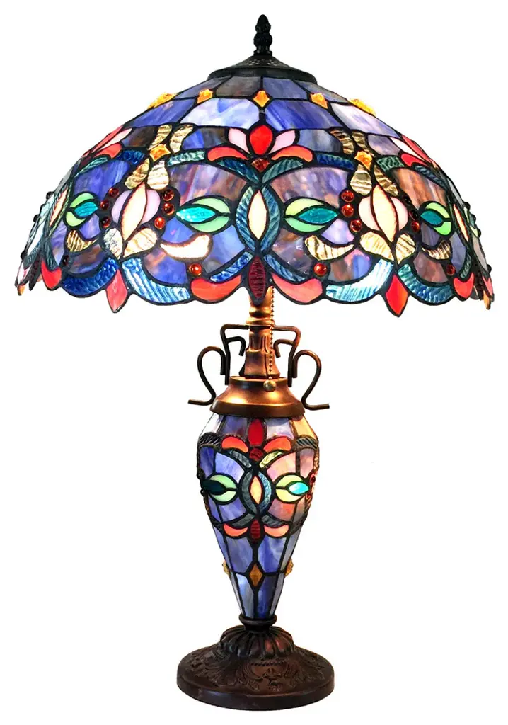 This Tiffany style 2+1-light double-lit table lamp features a dark antique bronze finish that will complement many decors throughout your home. Hand crafted from over 570 pieces of art glass and 78 beads that will add color and beauty to any space. Main colors are purple, blue, red, and green. Handcrafted using the same techniques that were developed by Louis Comfort Tiffany in the early 1900s, this beautiful Tiffany-style piece contains hand-cut pieces of stained glass, each wrapped in fine copper foil.Bulb Type: Incandescent; LED; Compact Fluorescent (CFL)Number of Bulbs: 3Bulbs Included: NoUL Listed: YesBulb Wattage: 100; 15Hardwire or Plug: Plug