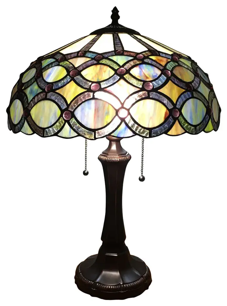 This Tiffany-style 3-light with matching base table lamp features a dark bronze finish and a lighted base that will complement many decors throughout your home. Hand crafted from over 495 individually hand cut pieces of art glass and 135 beads that will add color and beauty to any space.(2) 100 Watt max E26 Type A Bulb + 1-Max 25 Watt E12 Type C Bulb (Type A bulb not included) Pull chain & on-cord rotary switch495pcs glass cut, 135 beadsDownlightIndoor SettingGlass &/or Fabric Color: Multi-coloredShape: RoundBulb Type: Incandescent; LED; Compact Fluorescent (CFL)Max Wattage: 100;25Bulb Base: E26 Medium;E12/CandelabraBulb Shape: A19; C10Additional Warning or Disclaimers: Since these are hand crafted products, the exact color of glass pieces may vary. Colors of the glass will appear darker and less vibrant when not illuminated. Handmade glass will vary from one piece to the other; glass made at different times will also vary. Light bulbs used in lamps or ambient lighting may affect the appearance of the products. Stained glass product has been protected with mineral oil as part of the finishing process. Please use a soft dry cloth to remove any excess oil.UL Certification #: E345256