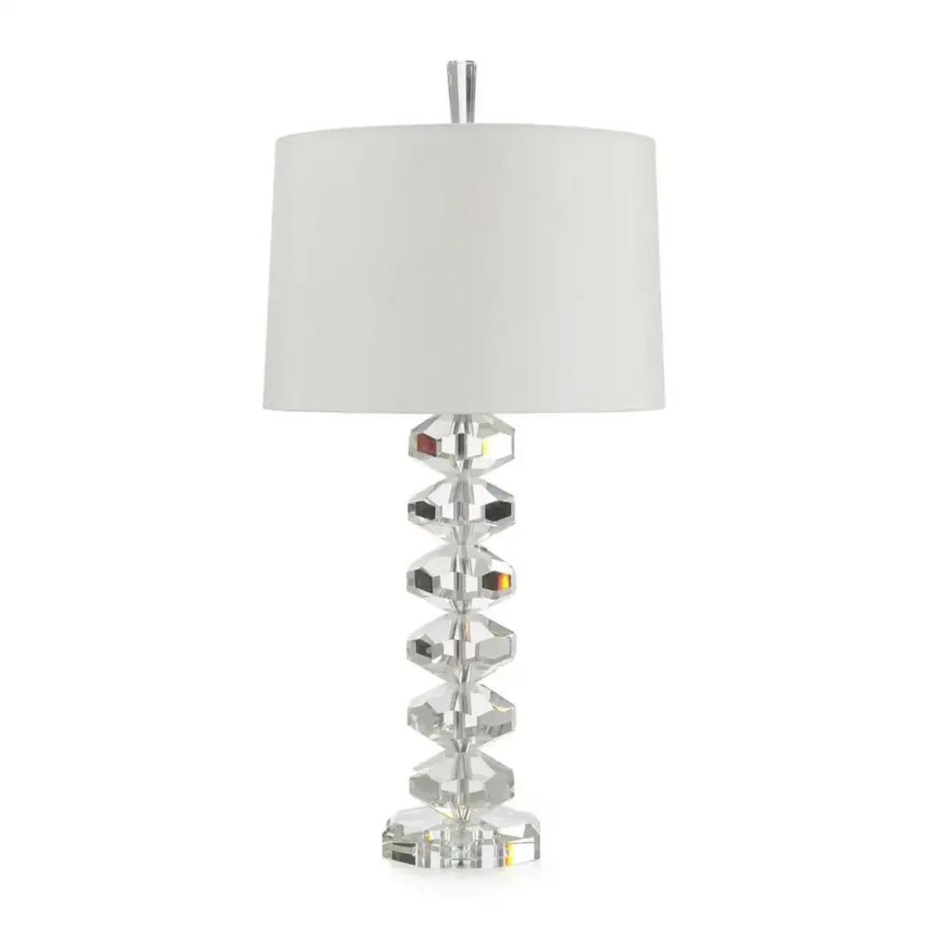 The Prismatic Table Lamp is a stunning piece that blends clear tones with a dimensional silhouette that imbues an interior space with a sense of tasteful sophistication. Crafted from clear crystal with metal hardware in a polished nickel finish, this three-way turnkey lamp exudes a pristine personality that greatly elevates any décor. The crystal body features an arrangement of diamond-like shapes with a matching base, creating a gorgeous geometric motif. A cylindrical glass finial rests at the top, completing the look.