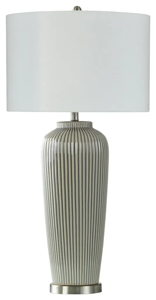 The StyleCraft Pristine Grey Table Lamp offers an updated modern take on classic style. An antique crackle finish on ribbed ceramic makes this table lamp an essential choice for the contemporary living room, entryway, or office space.Features - The base of this lamp has a ribbed design finished in a grey that has an dark and light affect.The grey pairs beautifully with the silver hardware and white shade.Since this lamp has a 3 way switch capability, you''re able to adjust the lighting to your personal needs.Due to the production process, each lamp will have a different finish and unique overall design - especially any glazed, painted, and oil rubbed designs.Due to lighting and monitor differences, actual colors and finishes may vary slightly from what appears online.