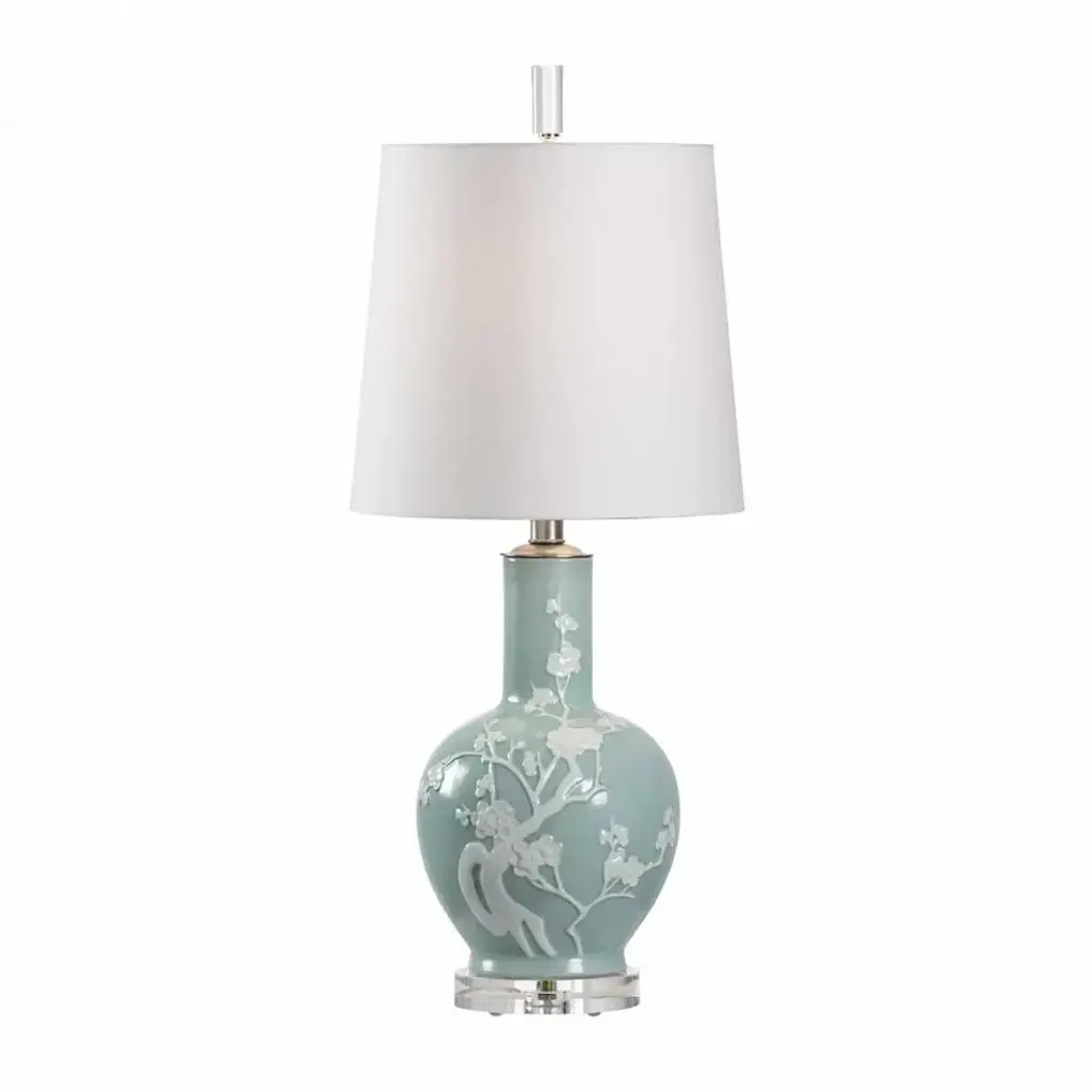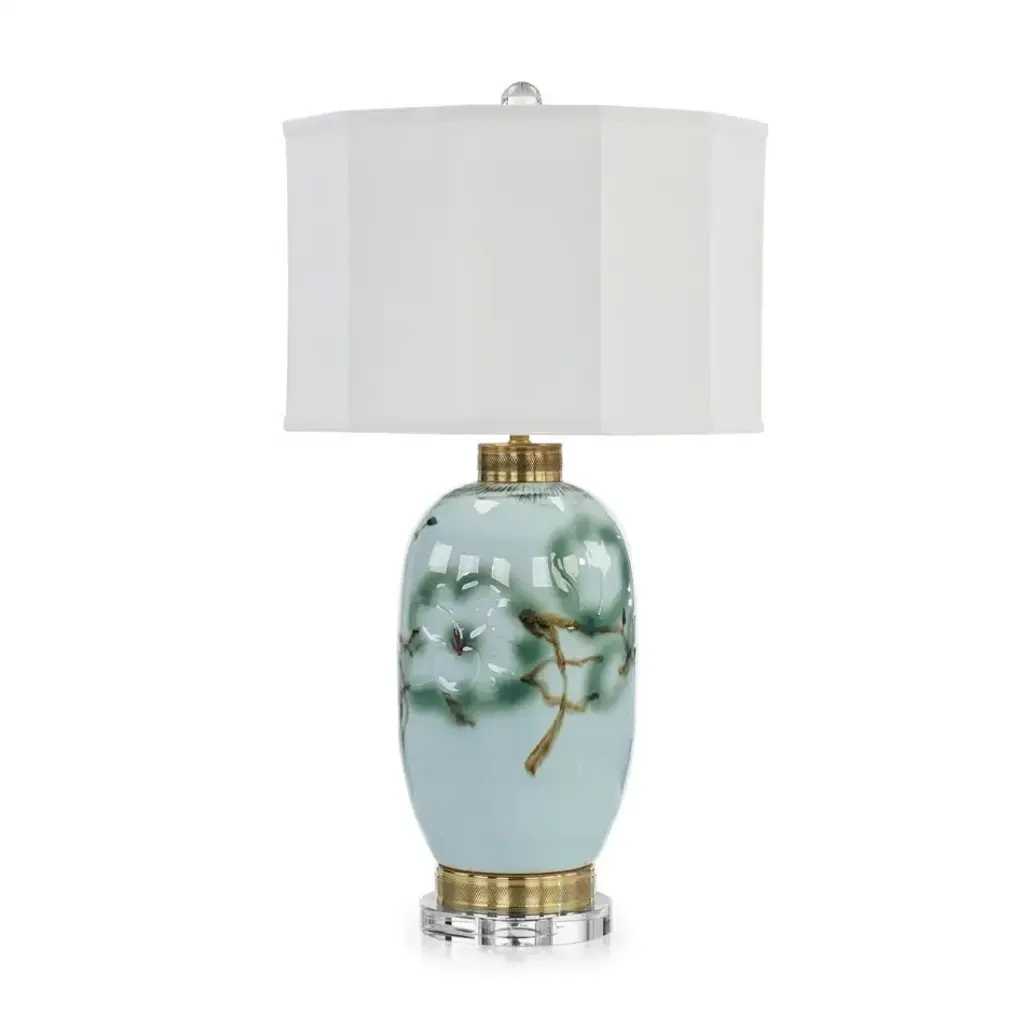 The Prodo Table Lamp is an artistic design accent created from natural inspiration. Crafted from glazed porcelain, the lamp showcases gorgeous hand-painted florals in green and brown tones. The piece sits atop a round crystal base with a slender Polished Brass accent. The look is completed with matching brass neck hardware and a ball finial, as well as a faceted white lampshade with rolled edges.