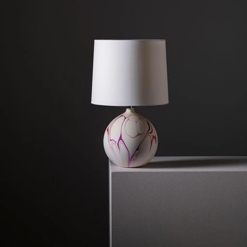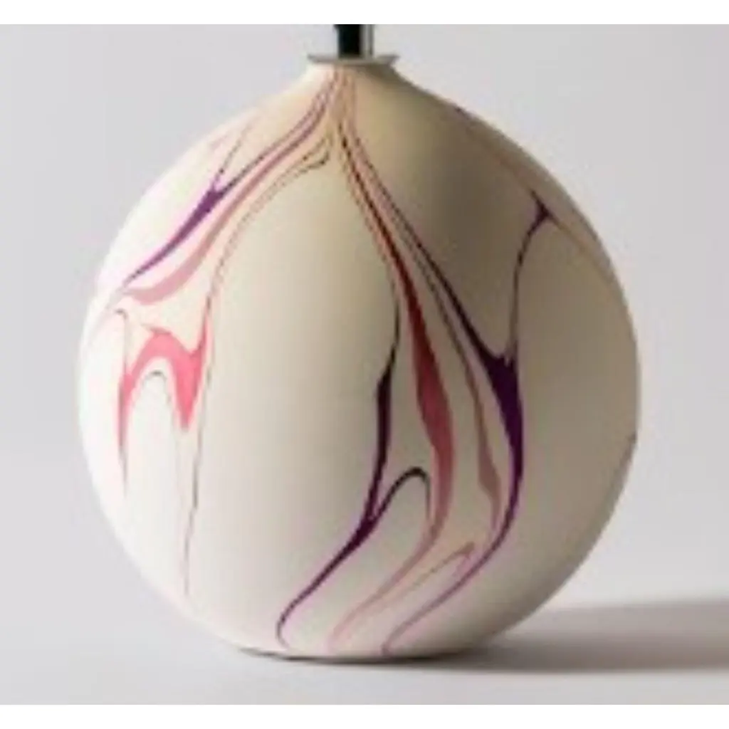 Prometheus Lamp by Elyse GrahamDimensions: D31 x H49 cmMaterials: Plaster, Resin, Cotton rag Paper, brass, Nickel. HARDWARE: POLISHED NICKEL-PLATED BRASS UNO THREADED SOCKETwith TURN KEY SWITCH, IN-LINE DIMMER.MOLDED, DYED, AND FINISHED BY HAND IN LA. CUSTOMIZATIONAVAILABLE.ALL PIECES ARE MADE TO ORDER. All our lamps can be wired according to each country. If sold to the USA it will be wired for the USA for instance.Our Hydro Collection is inspired by the grooves and patterns that waterways make through the landscape as seen from above. The layers of gradation in the pigment on the exterior of the bases reference topographical maps. We take queues for our palette from the rivers for which the pieces are named. Much like the rivers that inspire them, the pattern on each piece is unique. Each lamp base is hand-cast with hydrocal plaster inside of a unique balloon shape. The interior of each piece is poured with layers of resin, impregnating the plaster with added strength and hardness.We have developed a unique process for pigmenting the exterior of the bases that is based on the technique used for marbling paper. Each lamp base is sealed with a UV resistant acrylic coating. Our shades are made by hand using a heavyweight cotton rag paper and attached to a nickel-plated swivel fixture with a turn switch. An in-line dimmer switch on the cord provides adjustable light settings. Due to the nature of the UV sensitive materials in our lamp bases we recommend using LED lightbulbs exclusively.MEET OUR TEAMElyse Graham is the founder and creative director of the studio. Driven by Elyse’s unique vision of building a studio that fosters and emphasizes connection, play, and experimentation (of people, processes, and in turn the objects created and shared) our small team works closely and collaboratively on each project. Elyse received a BA in sculpture and semiotics at Brown University. After years of making sculpture and running a business in jewelry design, Elyse decided to merge her separate practices and redirect her attention toward collectible design in 2013. The creative trajectory of the studio is heavily influenced by Graham’s background in fine art, specifically her interest in process-driven and material-based artwork. The studio’s vocabulary of shapes, patterns, and forms comes from a lineage of unconventional processes Graham has developed and built for working with plaster and resin. Graham shares her studio as well as her home with her husband, Lewis Mauk and their daughter, Eero. Miller Robinson is head of our production department. From pigmenting and casting materials for all of our products in plaster and resin to graphic and production design, they wear many hats in our studio. Miller joined our team in 2014 and has been an integral part of designing many of our experimental processes that have lead to the creation of our unique MetaMATERIAL. Like Elyse, Miller has a background in material and process-oriented making, which led to an instant connection and collaborative understanding between the two. Miller received their BFA from Otis College of Art and Design with a focus on painting, installation, performance, and writing. Their individual art practice focuses on the preservation and potentialities of underrepresented histories and encompasses objects, garments, actions, tattooing, and books. Their personal work has been exhibited in Los Angeles at the Southwest Museum, Los Angeles Municipal Art Gallery, Heritage Square Museum, and with Los Angeles Contemporary Exhibitions (LACE), as well as HORESEANDPONY Fine Arts in Berlin.Lewis Mauk is our studio and operations engineer. Working on facilities and production design as well as engineering and leading all of our large-scale constructions and installations, Lewis’ unique set of technical skills gives form and structure to our studio’s unconventional ideas and processes. Lewis has been working behind-the-scenes since the creation of the studio but joined our team full-time in 2020. Consistent with the rest of our team, Lewis has a background in process-driven fine art and has extensive training in woodworking, printmaking, and photography. He received a MFA from CalArts and has worked across the fields of education and fabrication. Lewis’ combined interest in the creation of personal archives mixed with his commitment to sustainable life practices, has brought a focus and important emphasis on designing studio projects and processes that imagine ways to reduce and reuse studio material fragments.