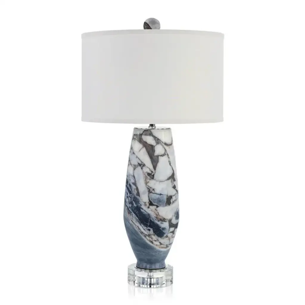 The Provence Table Lamp leverages natural material to create a stylish contemporary look. Crafted from marble, the body showcases gorgeous organic patterns in blue, white, and brown tones. Slender metal accents in Polished Nickel adorn the neck and round crystal base. The look is completed with a ball finial, matching the body, and a white hardback drum shade.