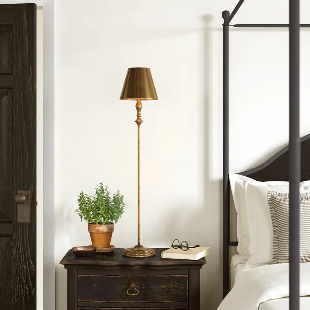 Graced by an antique gold finish, this vintage-inspired table lamp with a metal shade exudes charm and character. Place this gorgeous lamp on a tabletop or mantle to add a spark of glamour.