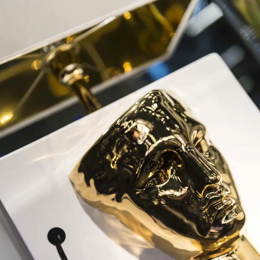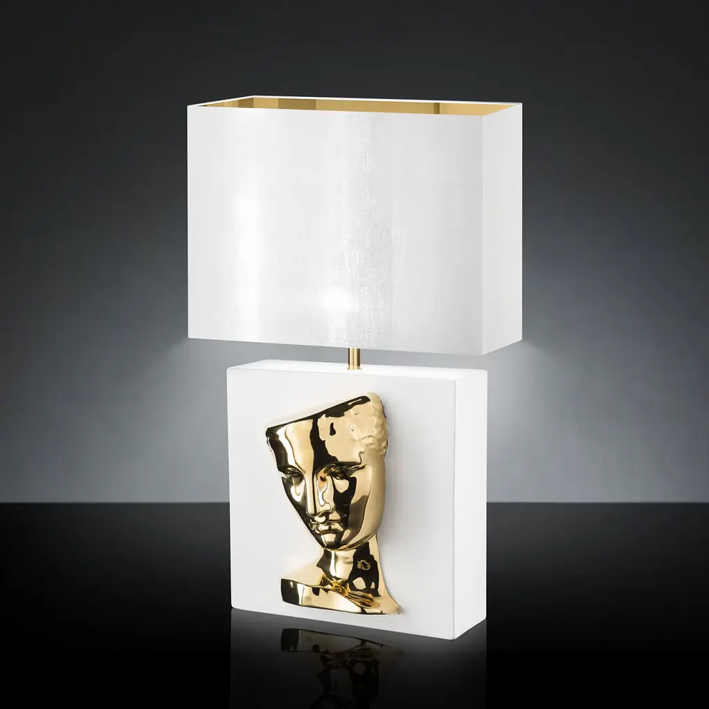 A sublime synthesis of modern volumes, luxe finishes, and classic inspiration defines this splendid table lamp. Crafted following artisan methods, it is named after the famous female bust retrieved in the 18th century and here reproduced in a tridimensional rendering - offered in a glaring golden finish - that stands against the parallelepiped-shaped white ceramic base. It fits an E27 bulb (max. 50W).