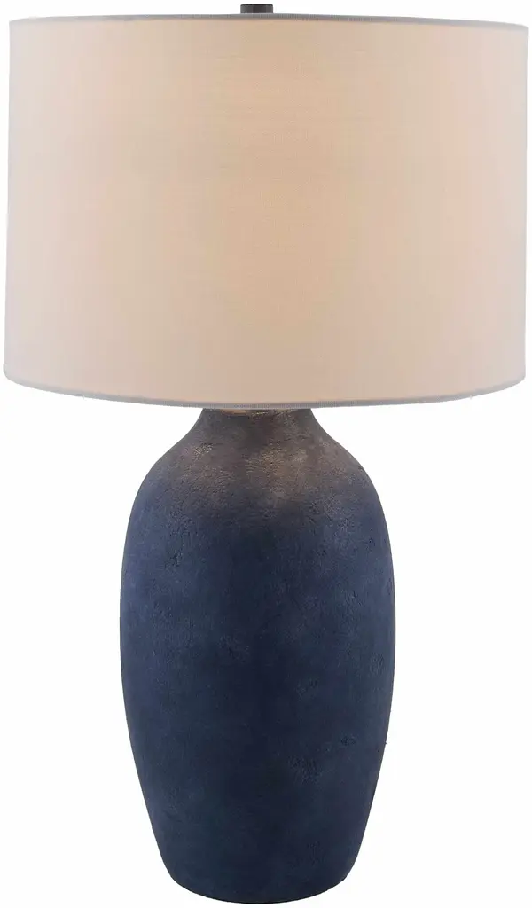 Collection: Pullambadi Colors: Navy, White, Metallic - Nickel, Translucent Material: Body: Cement / Shade (Outside): Linen / Shade (Inside): Linen / Finial: Iron Styles: Traditional Made In: China Lighting Type: Accent Table Lighting Shade Material: Linen, Linen Shade Color: White, White Cord Length: 6' Switch Type: 3-Way Number of Bulbs: 1 Socket Type: E-26 Bulb Wattage: 100W