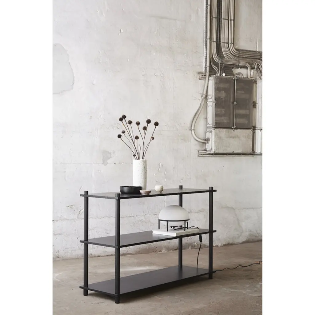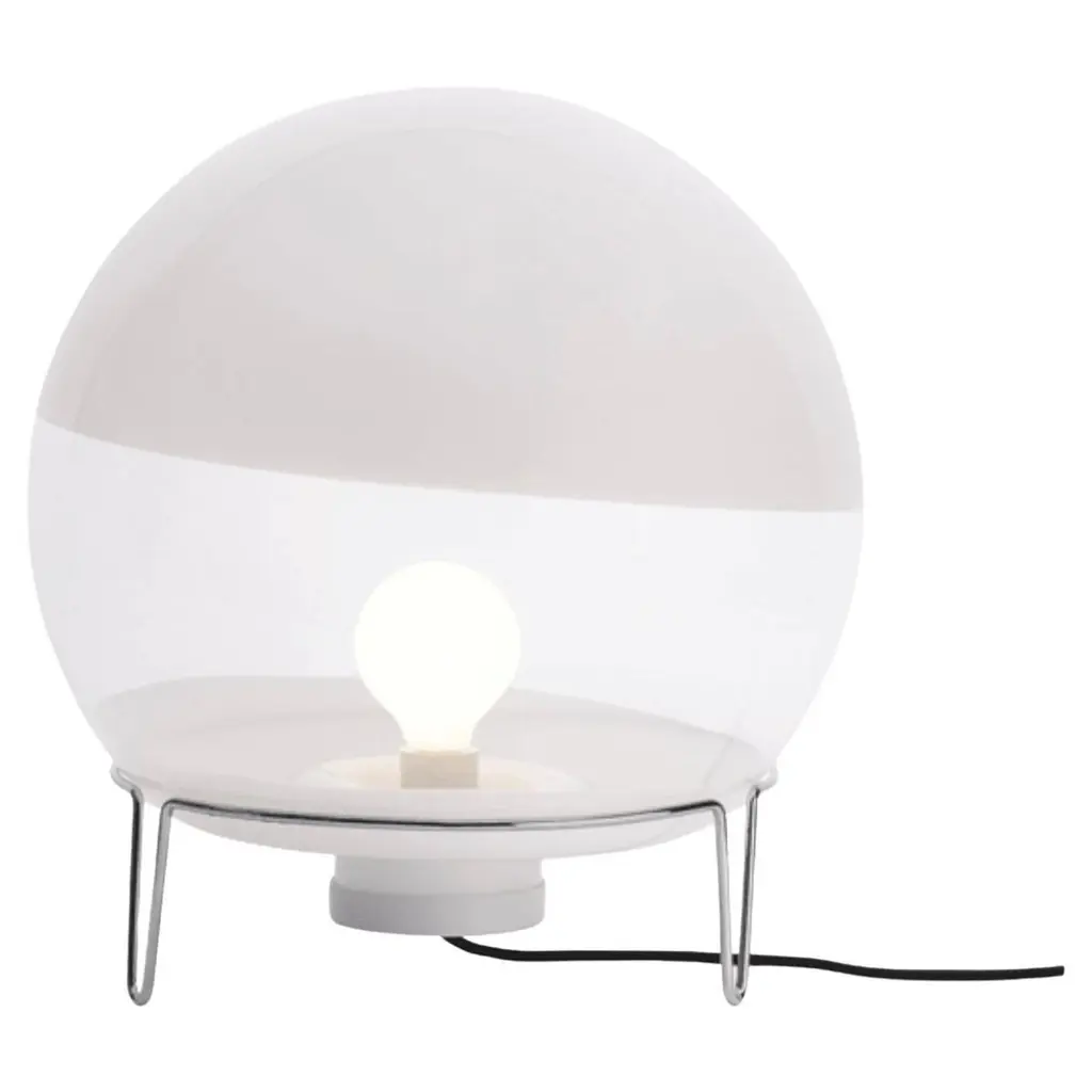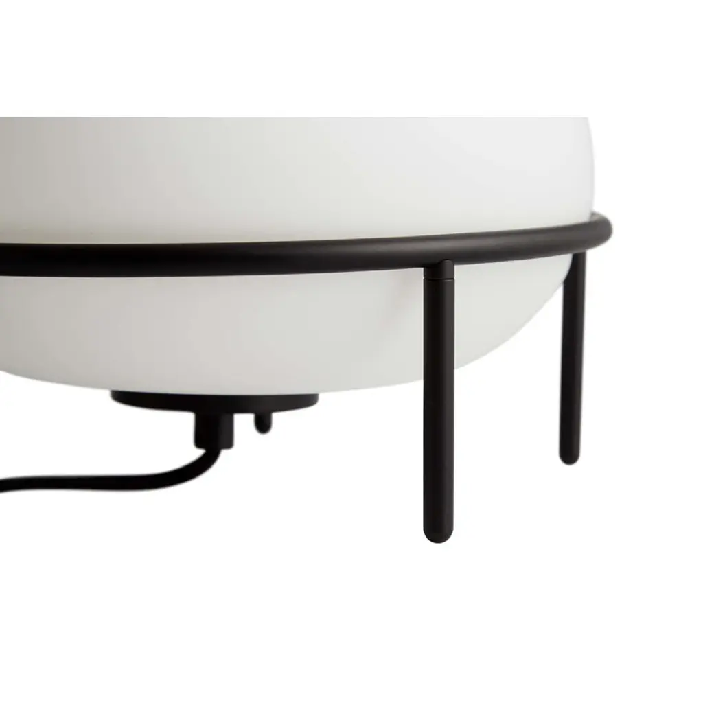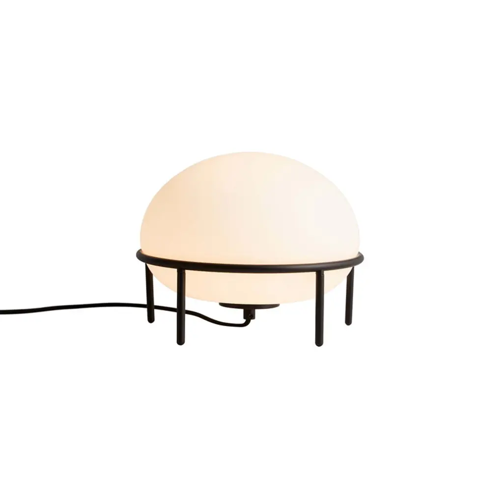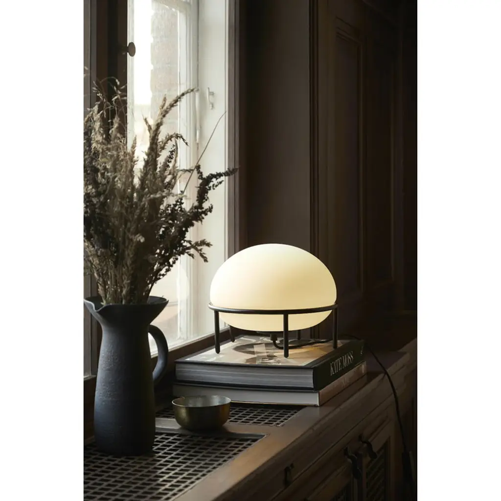 Pump table lamp by Woud has an airy appearance inspired by a hot air balloon lifting off the ground. Designed by Kutarq Studio, Pump lamp features a wide, round opal glass shade that almost appears to be floating on the black steel base. Pump lamp is ideal on a nightstand, windowsill or shelf, and it complements the general lighting with a soft, gentle glow.