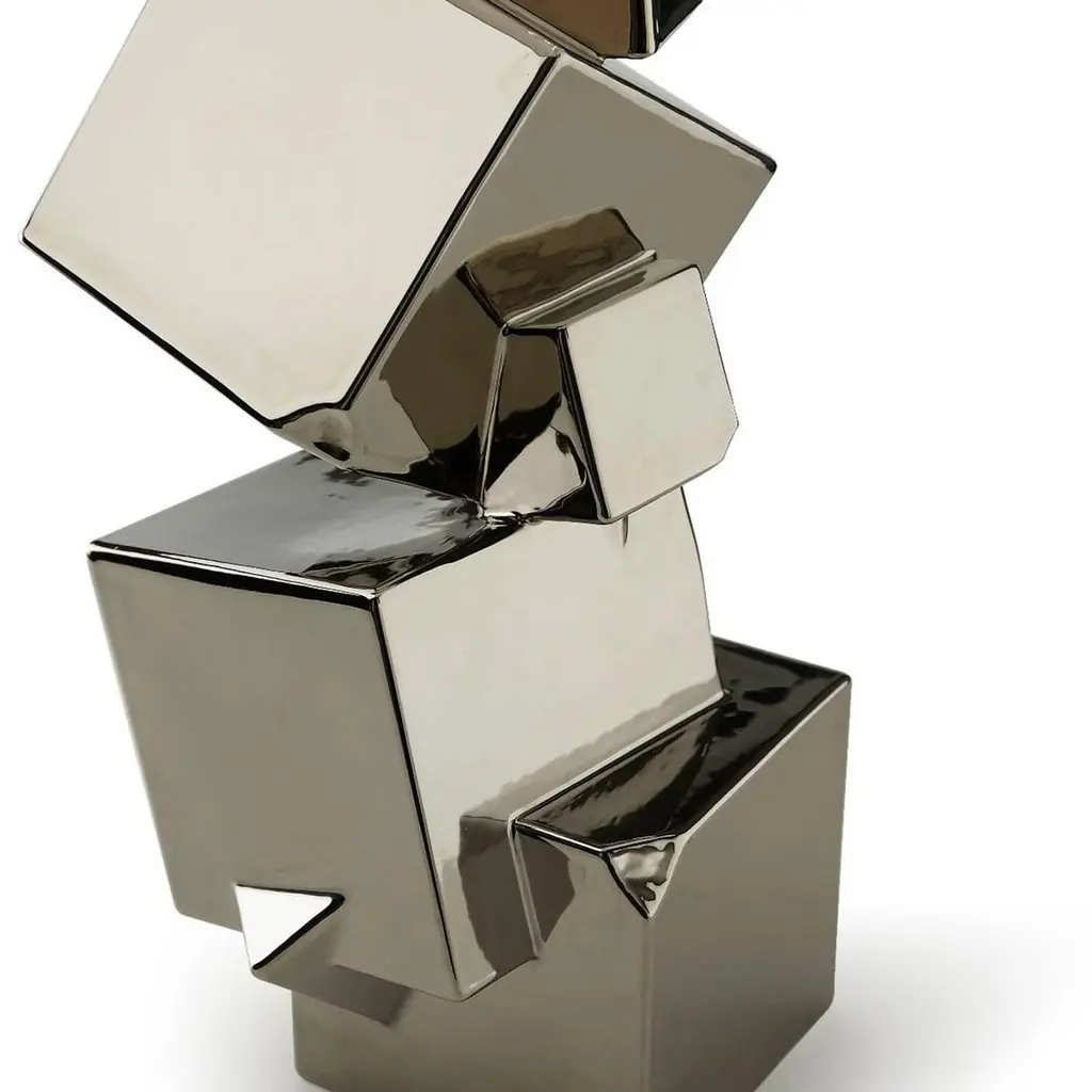 Part of the Pyrite collection, this table lamp features a rectangular shade that complements the decoration of the body made of several cubes juxtaposed at different angles. The structure is made of ceramic with a glossy silver finish and is both sophisticated and bold, reflecting the light from above in unique ways. Other colors and finishes are available.